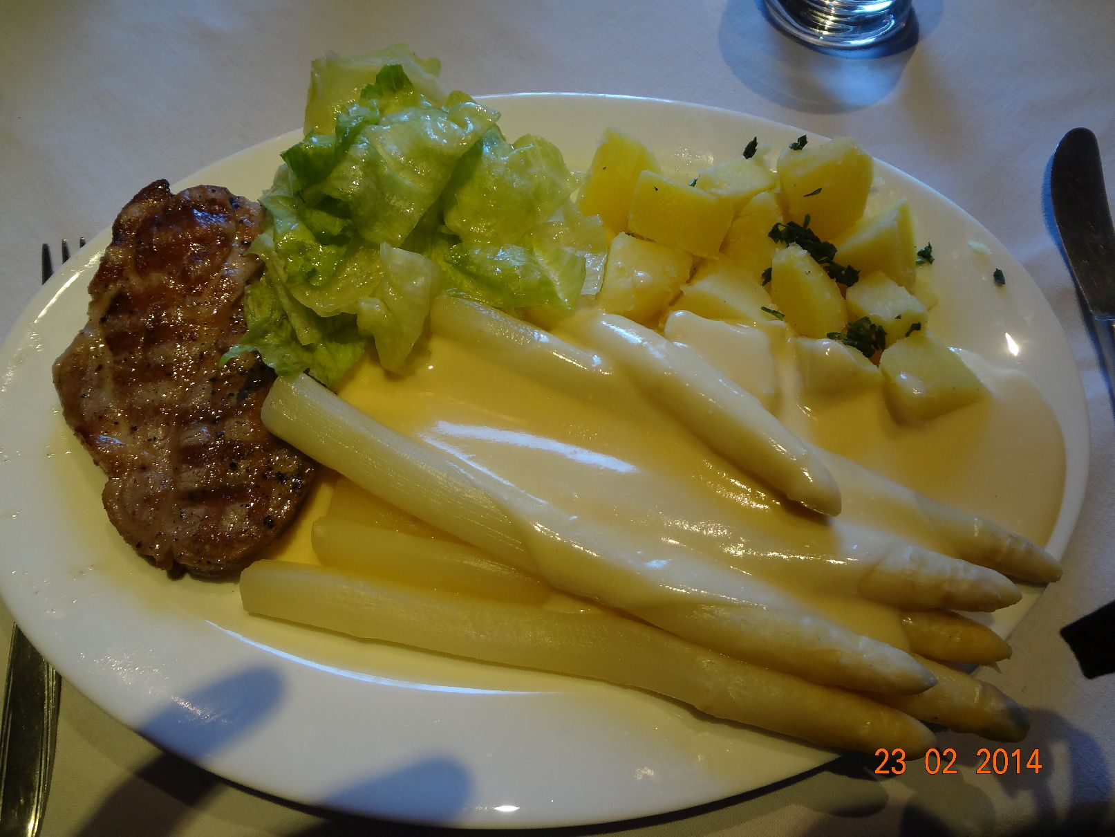 | Steak mit Spargel, Rosmarin-Kartoffeln und Eisberg-Salat |