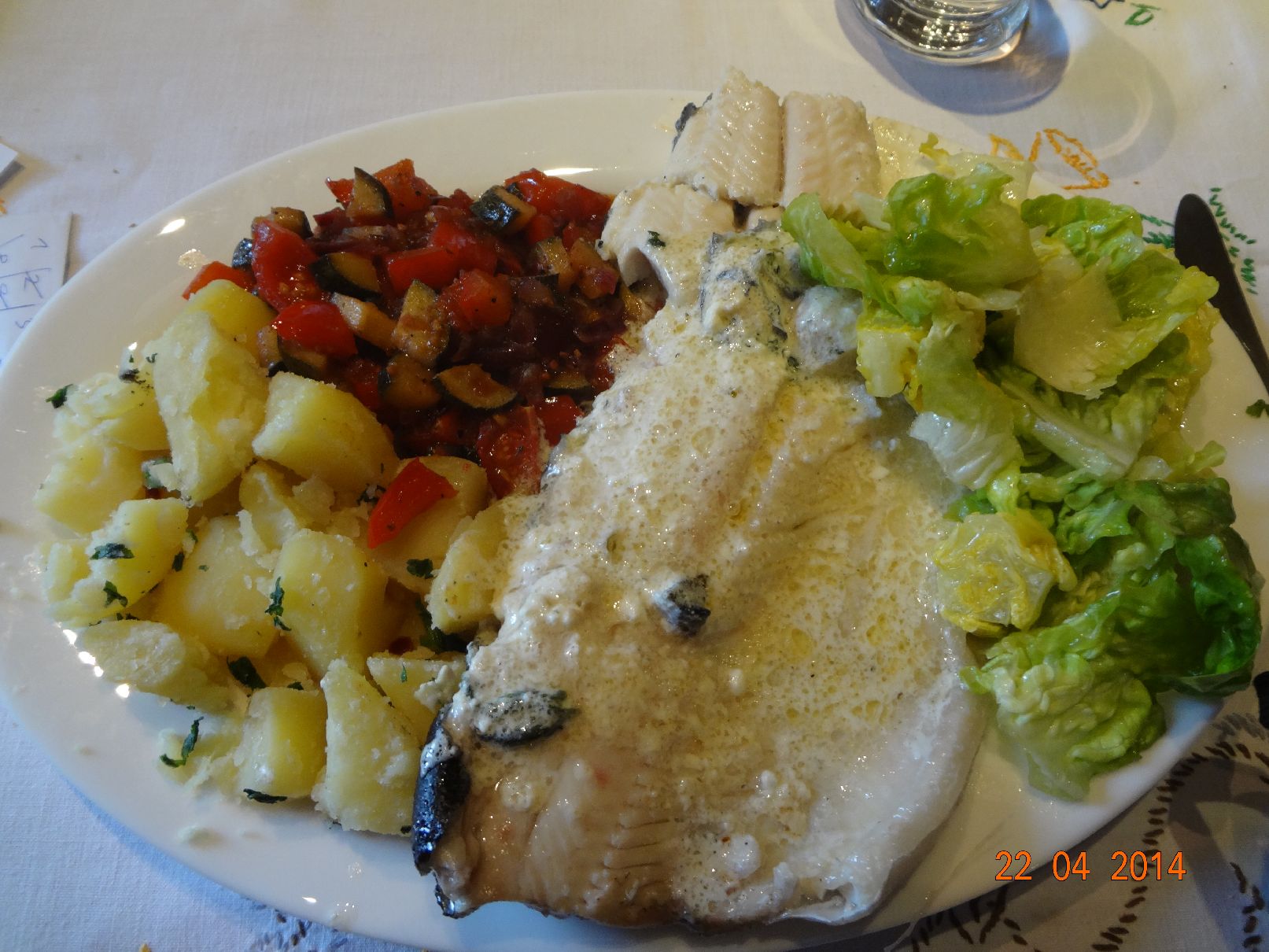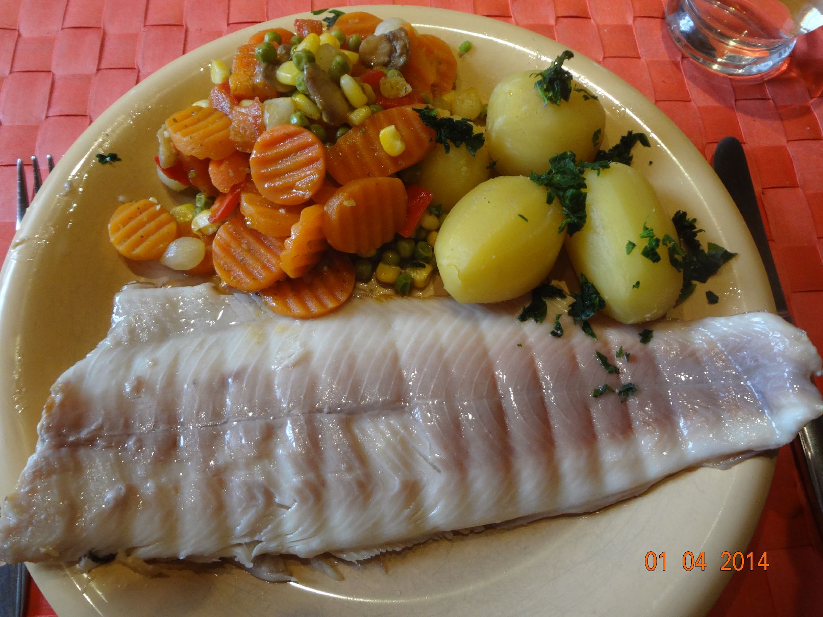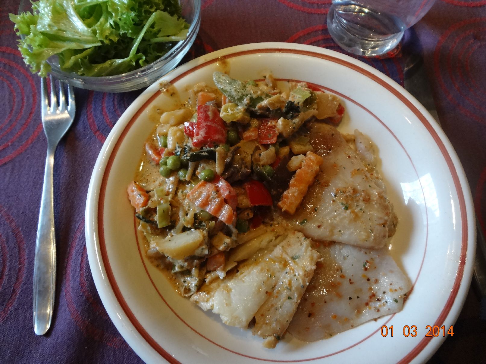 | Pochierter Fisch mit Kartoffel-Möhren-Sellerie-Gemüse und Eisberg-Salat |