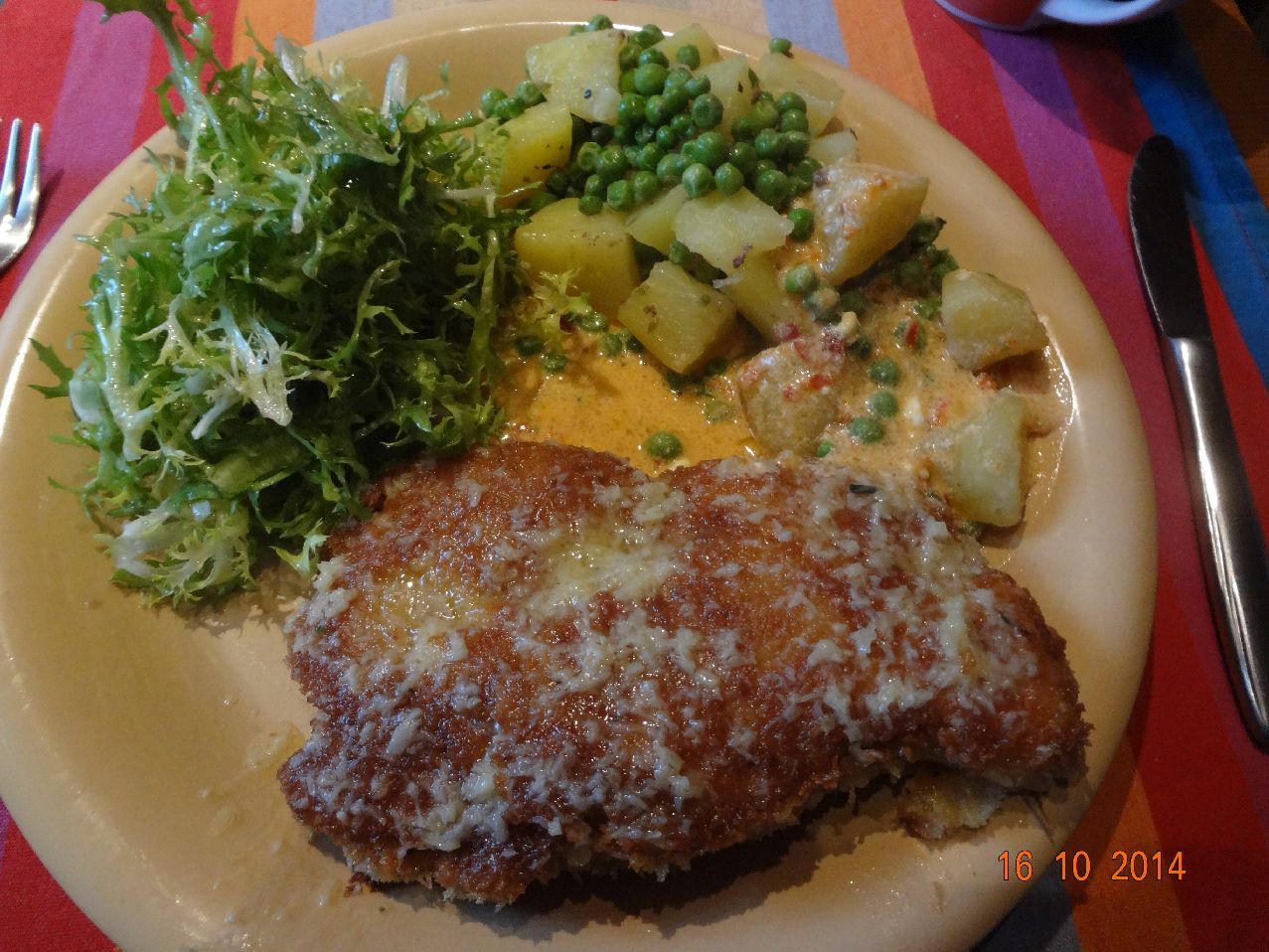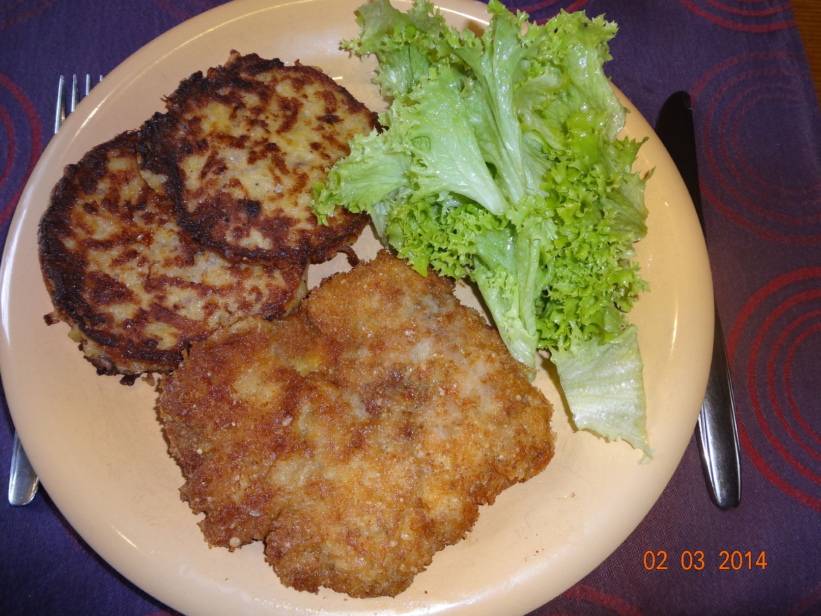 | Hähnchen-Käse-Schnitzel mit Kartoffel-Kohlrabi-Rösti und Lollo-Bionda-Salat |