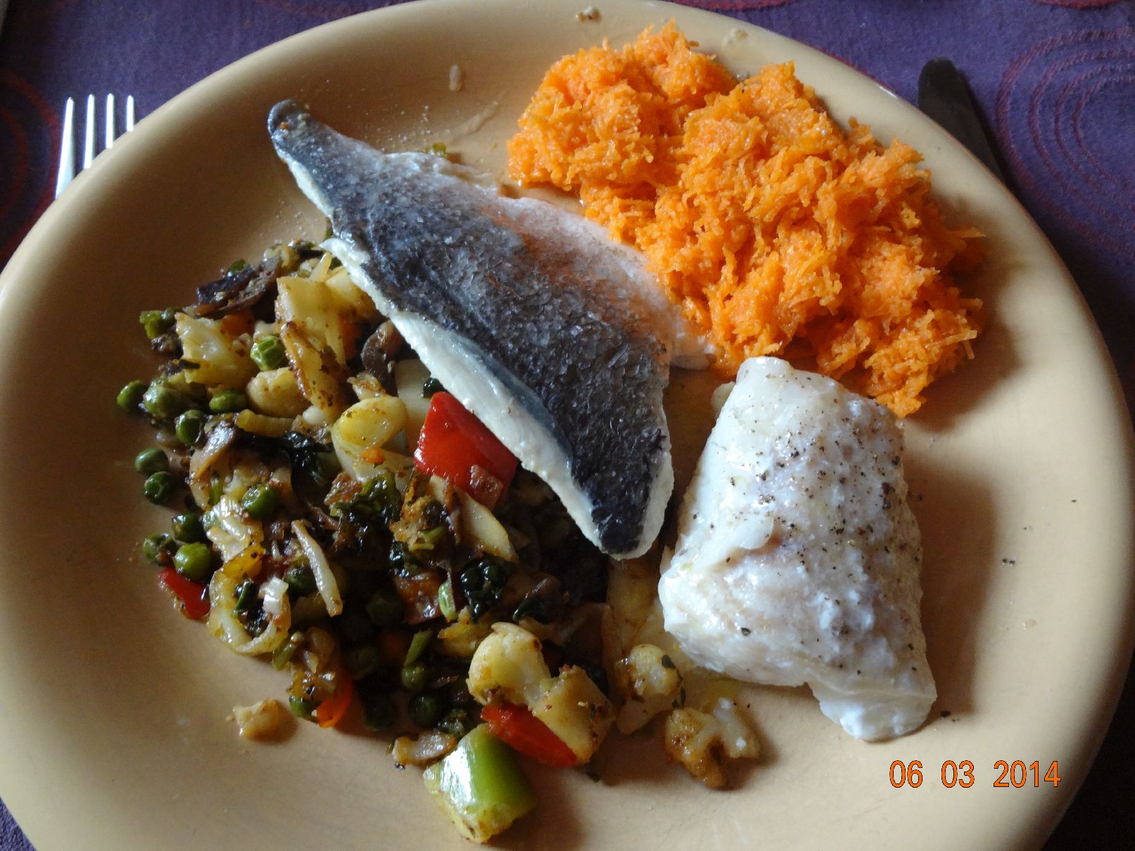 | Kabeljau, Dorade, Asia-Gemüse und Möhren-Salat |