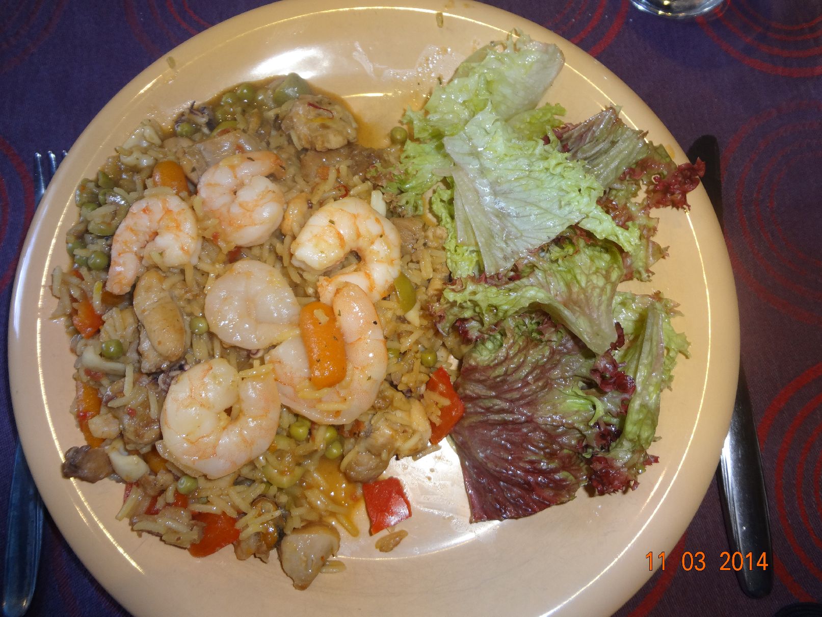 | Paella mit Garnelen und Salat |