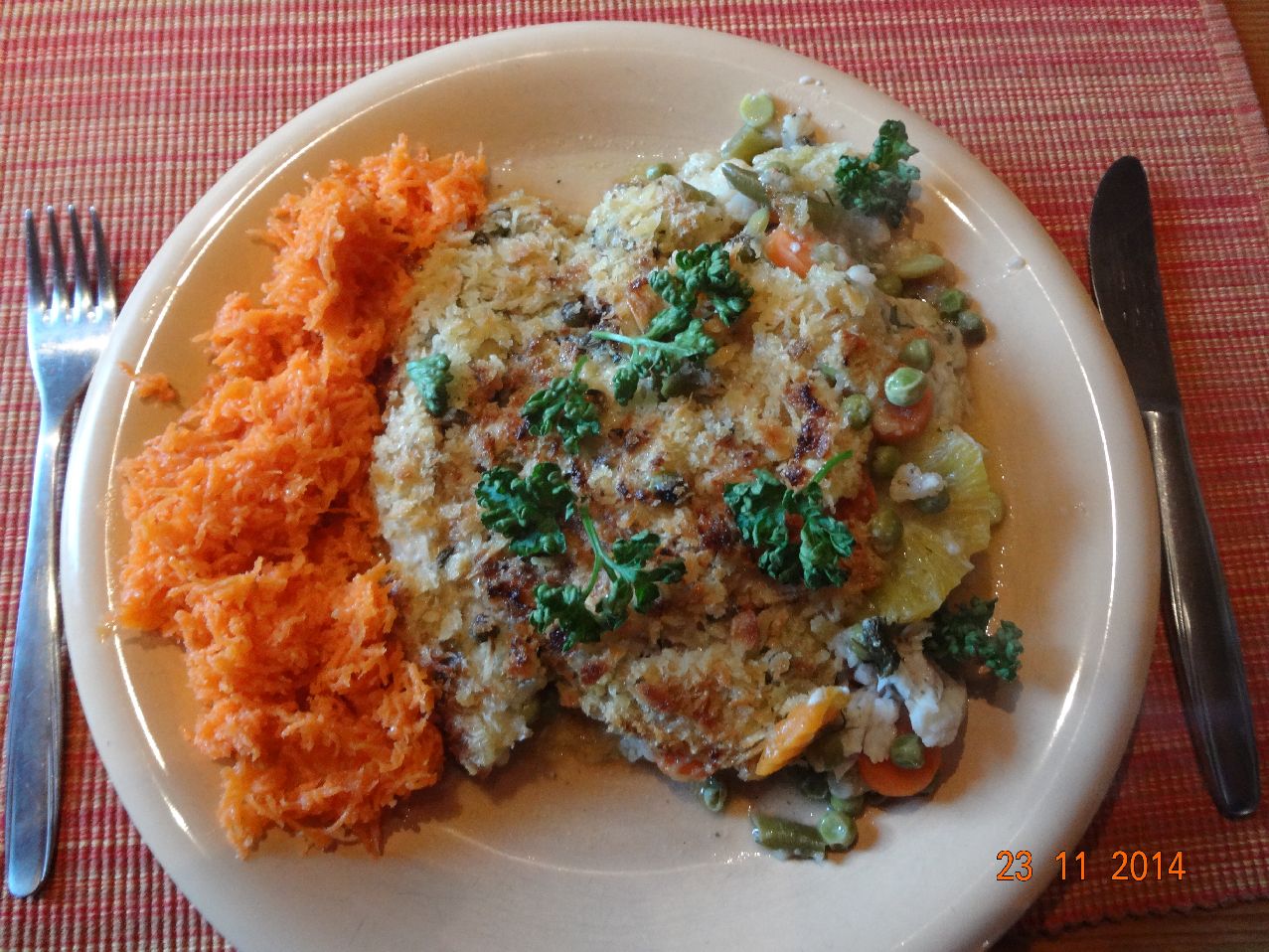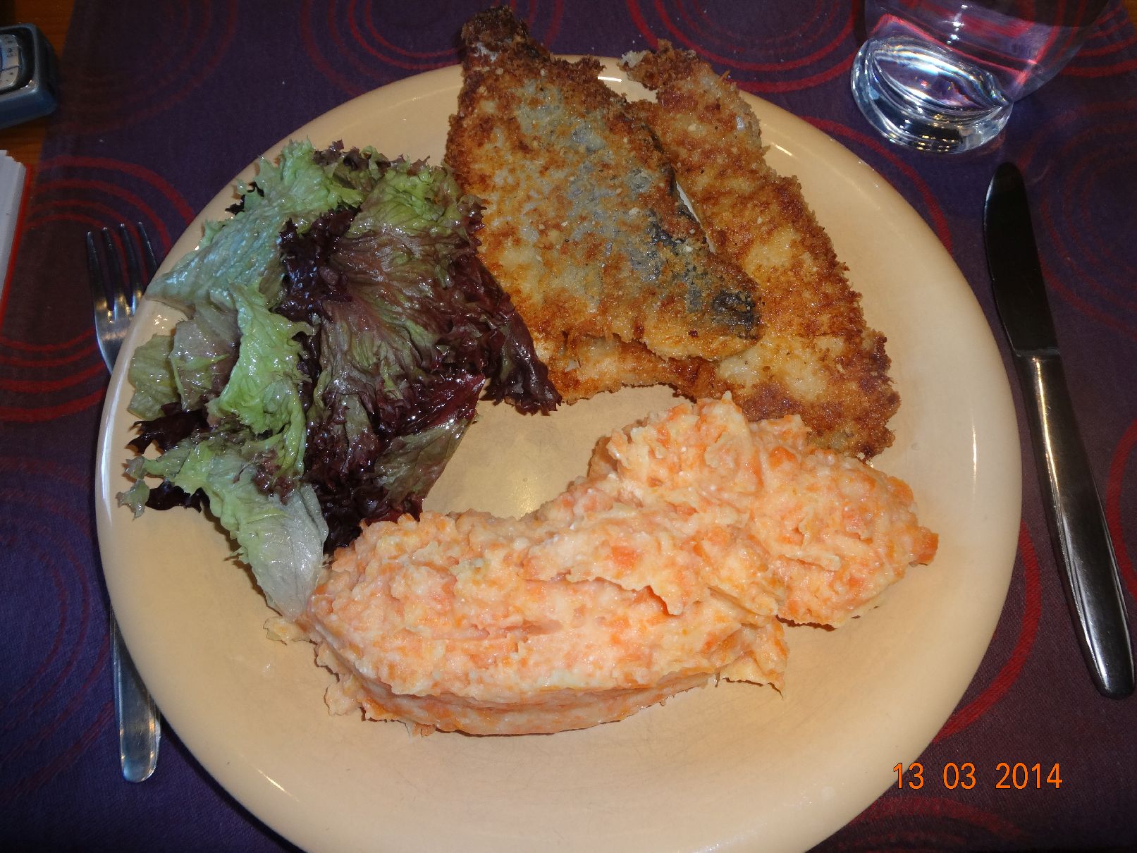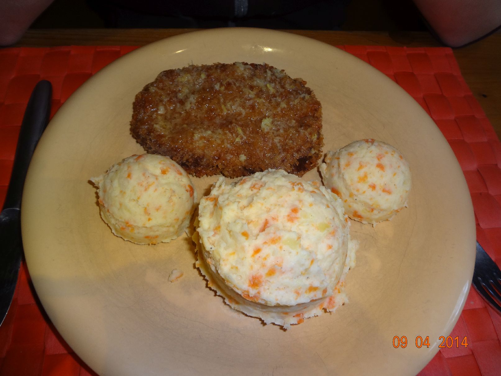 | Fisch im Panko-Käse-Mantel und Kartoffel-Möhren-Püree |