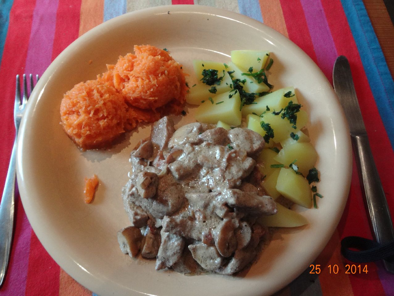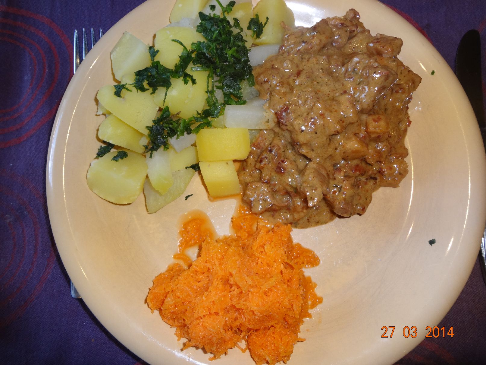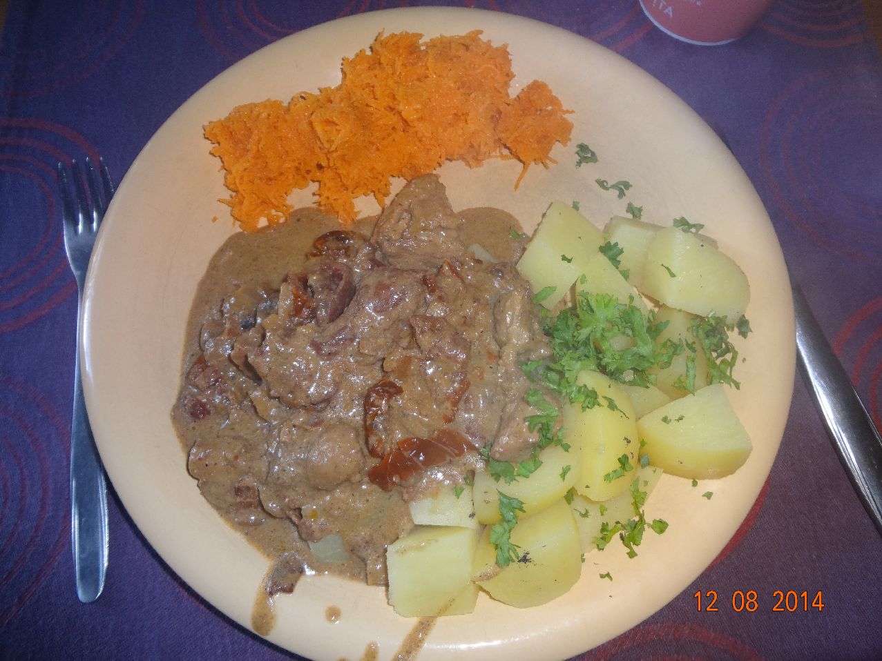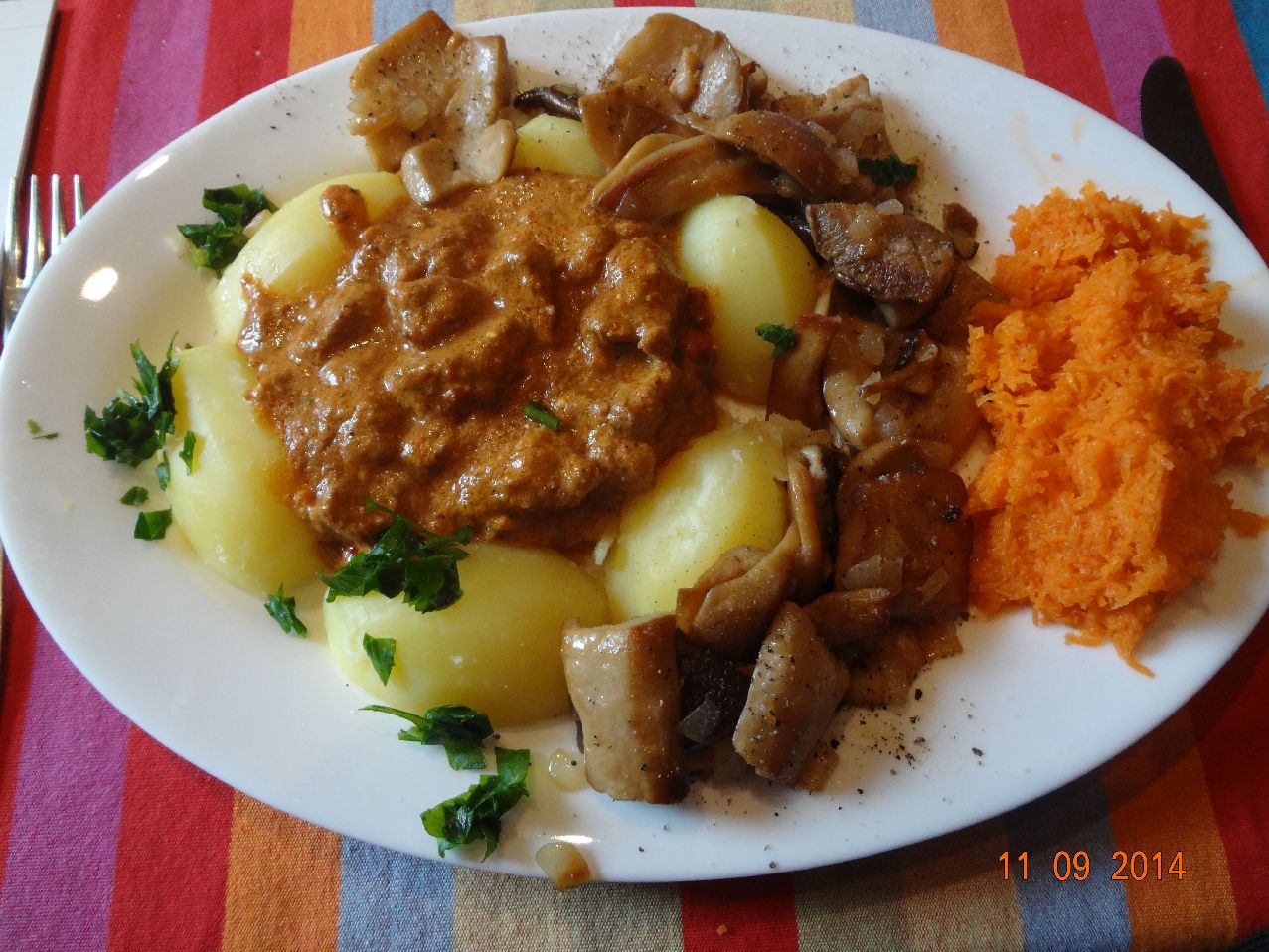 | Schweine-Pilz-Gulasch mirt Rauchsalz-Kartoffeln und Möhren-Salat |