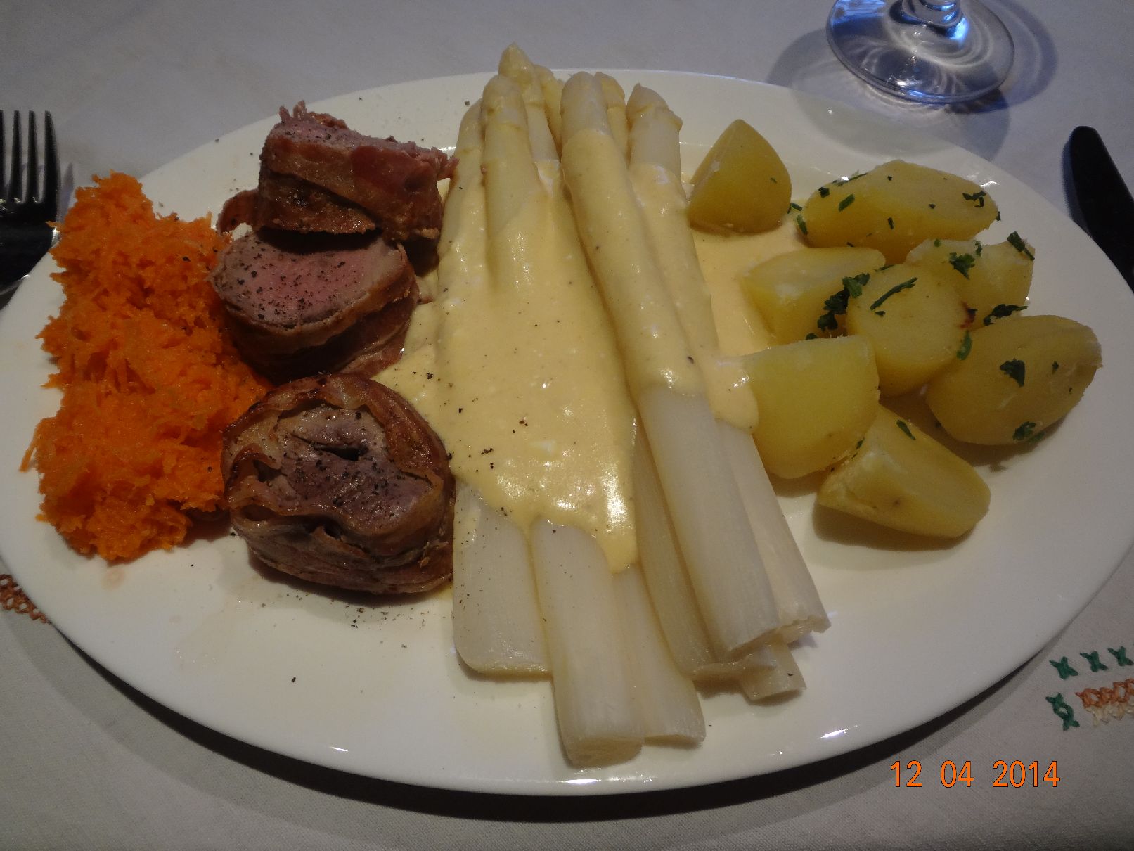 Schweine-Filet-Medaillons, Spargel, Rosmarin-Kartoffeln, Möhrensalat |