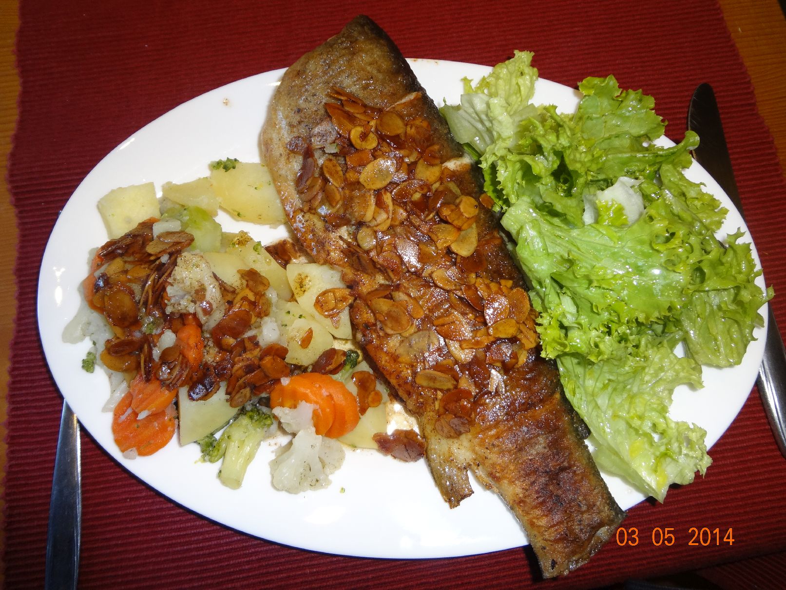 | Forelle Müllerin mit gerösteten Mandelblättchen und Gemüse-Kartoffeln |