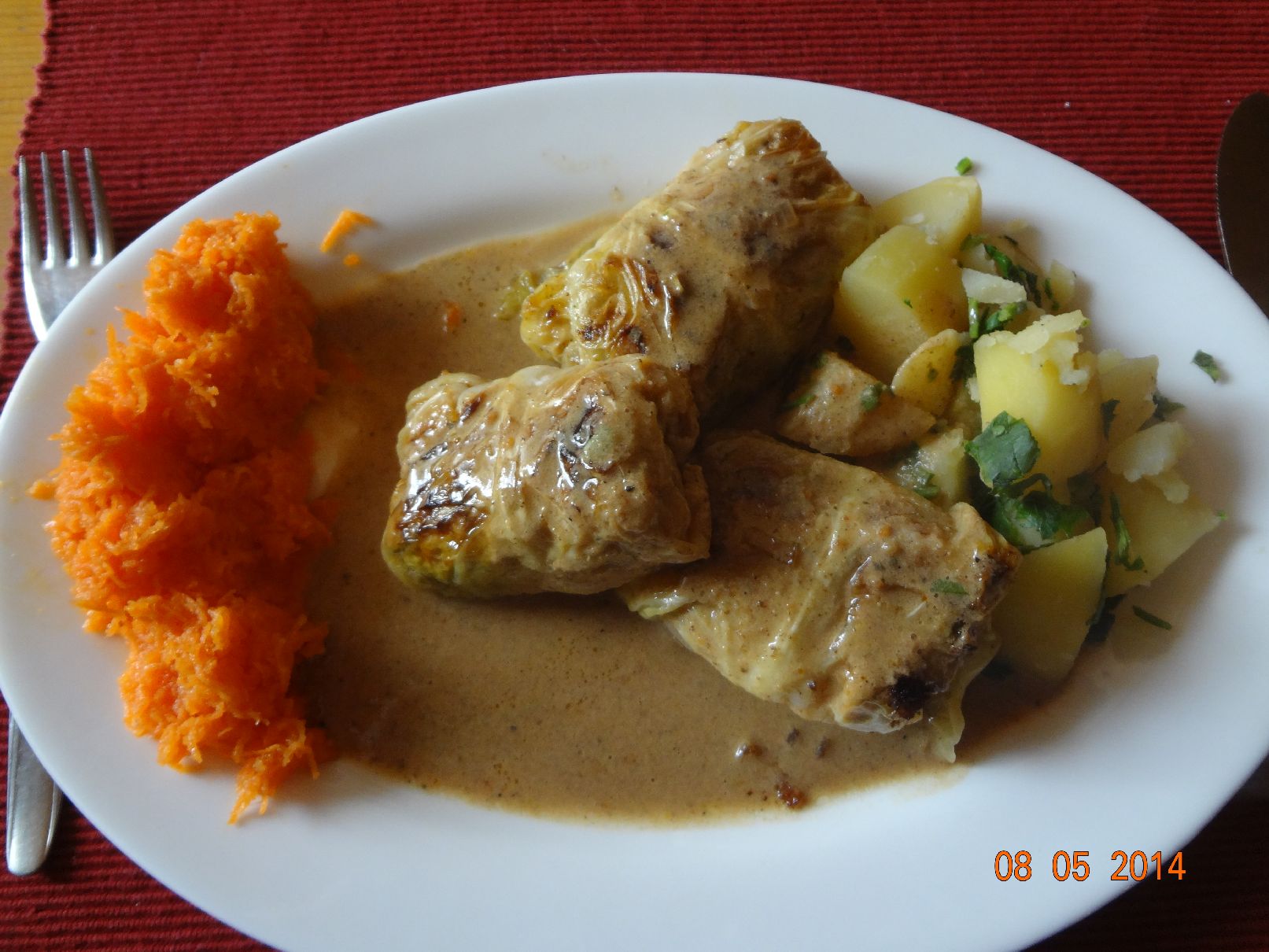 | Wirsingkohl-Rouladen mit Pilz-Soße, Rauchsalz-Kartoffeln und Möhren-Salat |