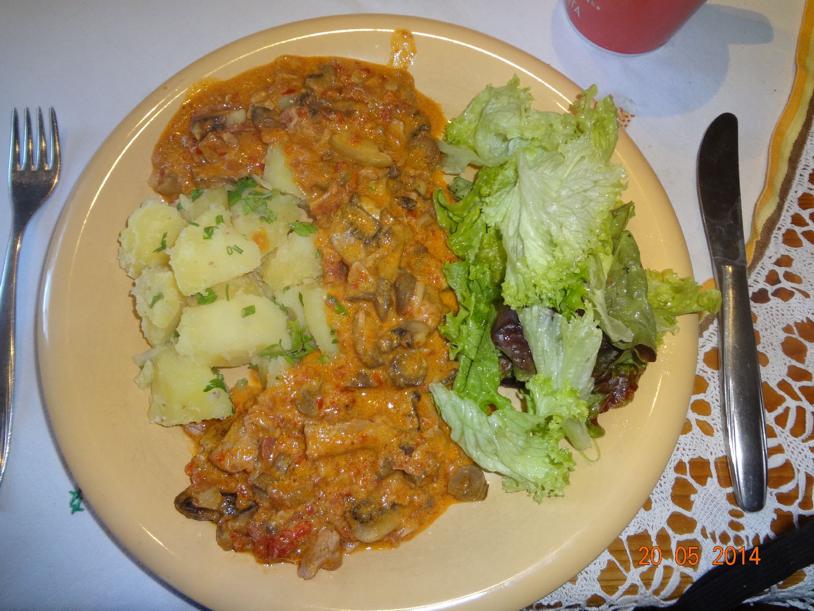 | Pilz-Gulasch, Pet.-Kart., Salat |