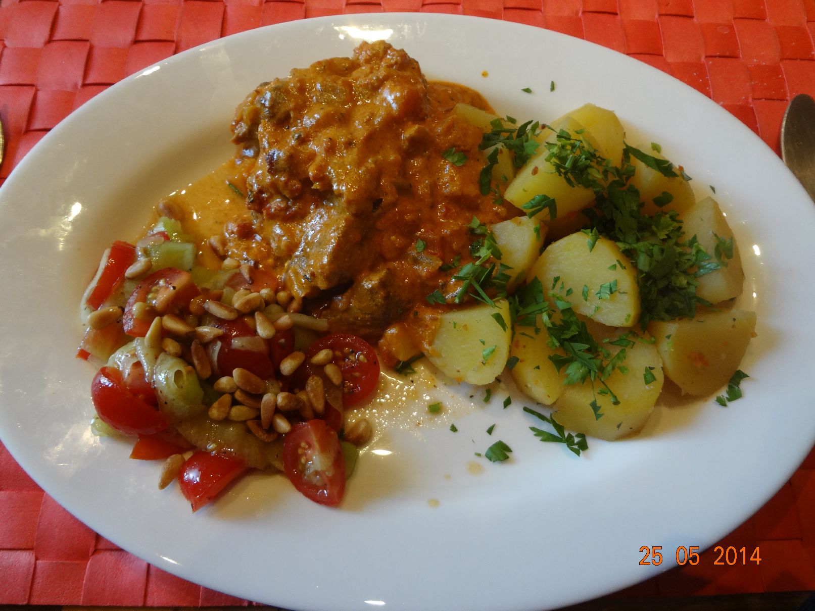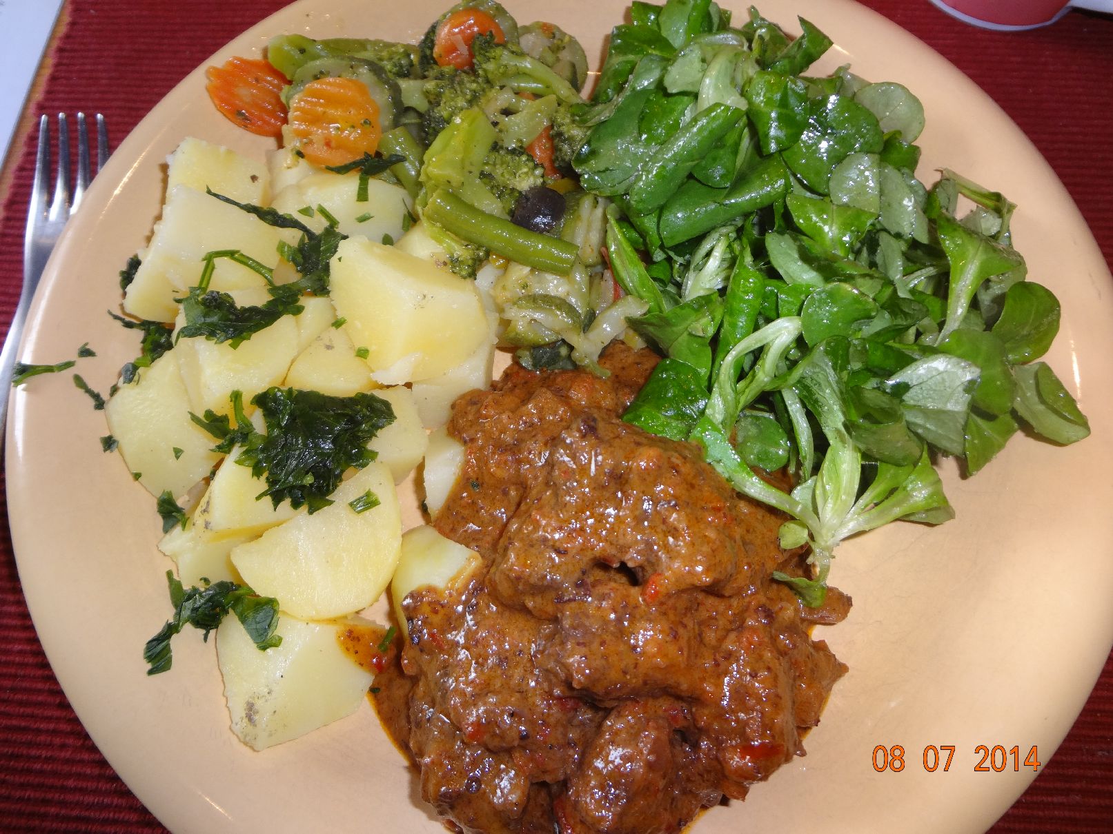 | Lamm-Gulasch mit Petersilein-Kartoffeln und Salat |