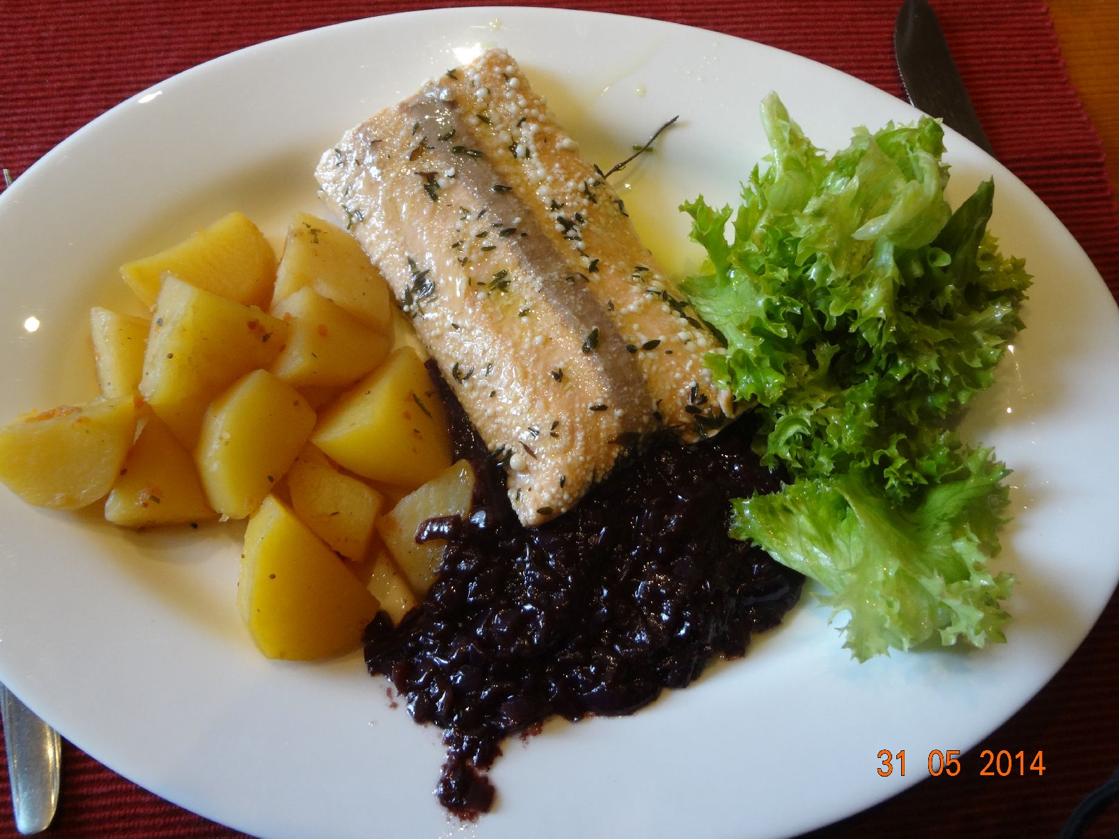 | In Öl gegartes Lachs-Filet auf Zwiebel-Rotwein-Soße mit Rauchsalz-Glutamat-Kartoffeln |