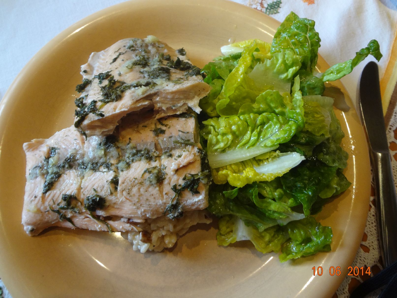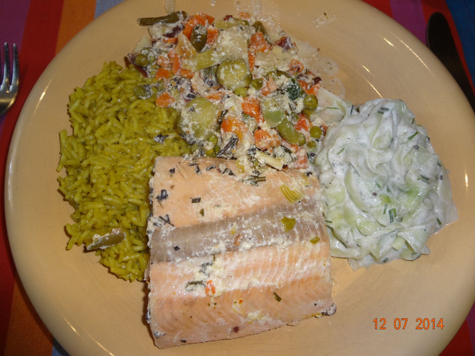 | Lachs-Filet in Gemüse gedämpft mit Safran-Reis und Gurken-Salat |
