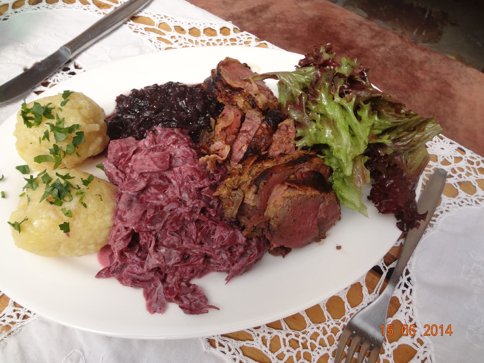 | Schwein-Filet, Rotkohl, Rotwein-Zwiebel-Soße und Knödel |