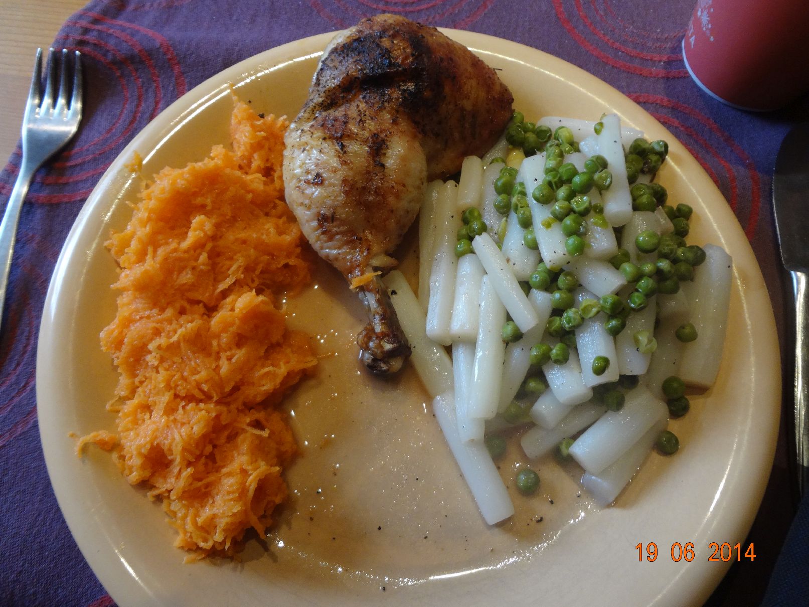 | Gegrillte Hähnchen-Schenkel auf Spargel-Erbsen-Gemüse mit Möhren-Salat |