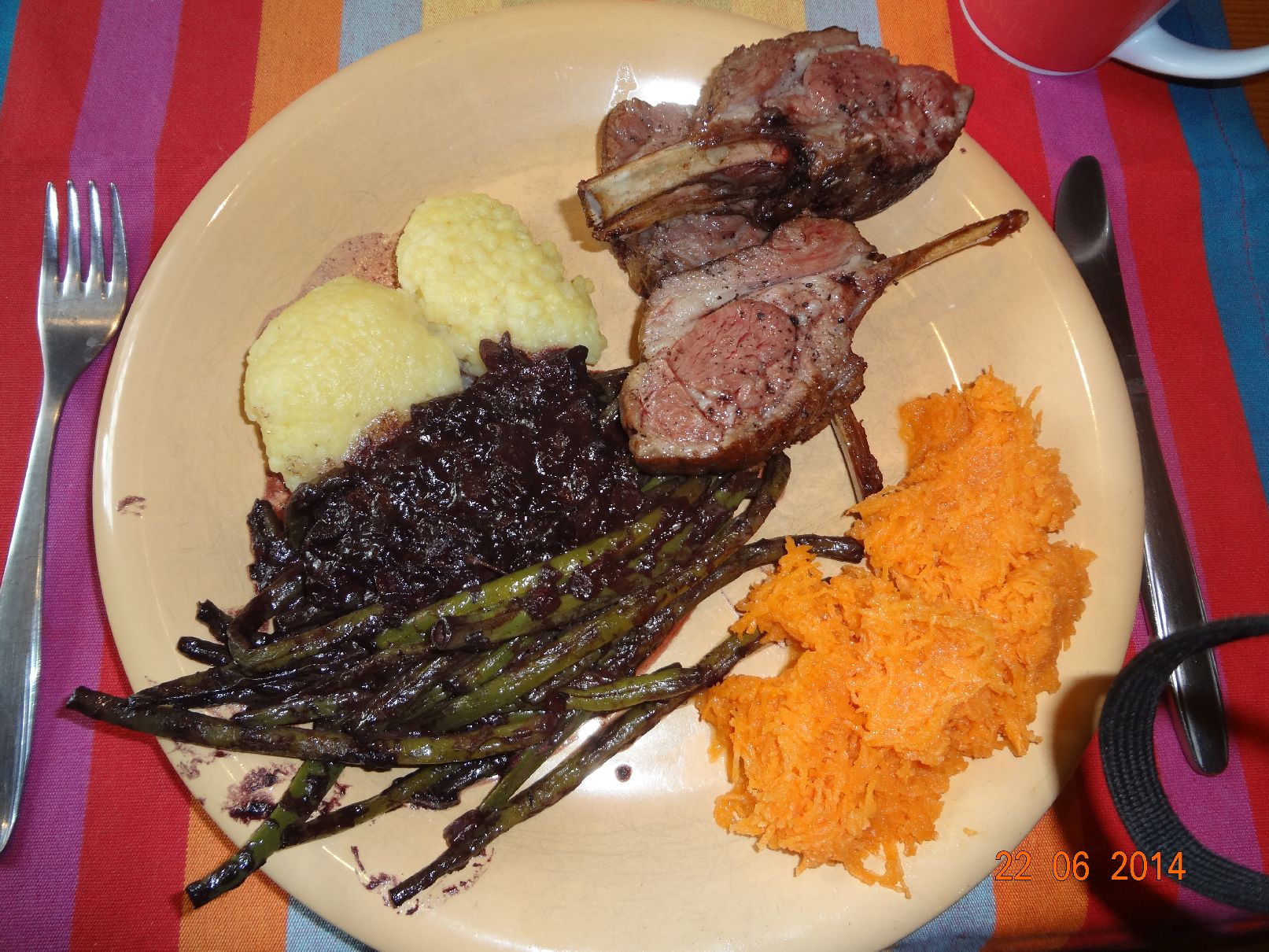 | Lamm-Karree mit grünen Bohnen in Rotwein-Zwiebel-Soße und Knödel |