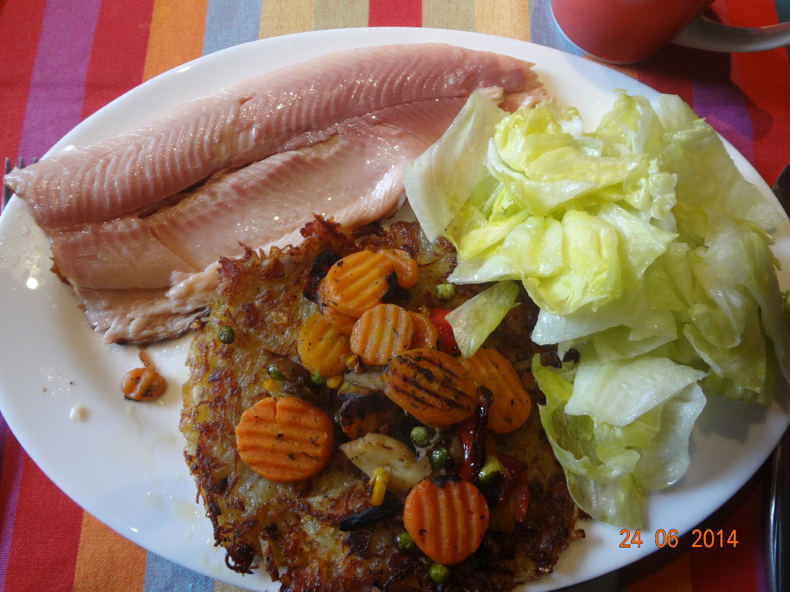 | Räucher-Forelle mit gemischtem Gemüse auf Rösties |