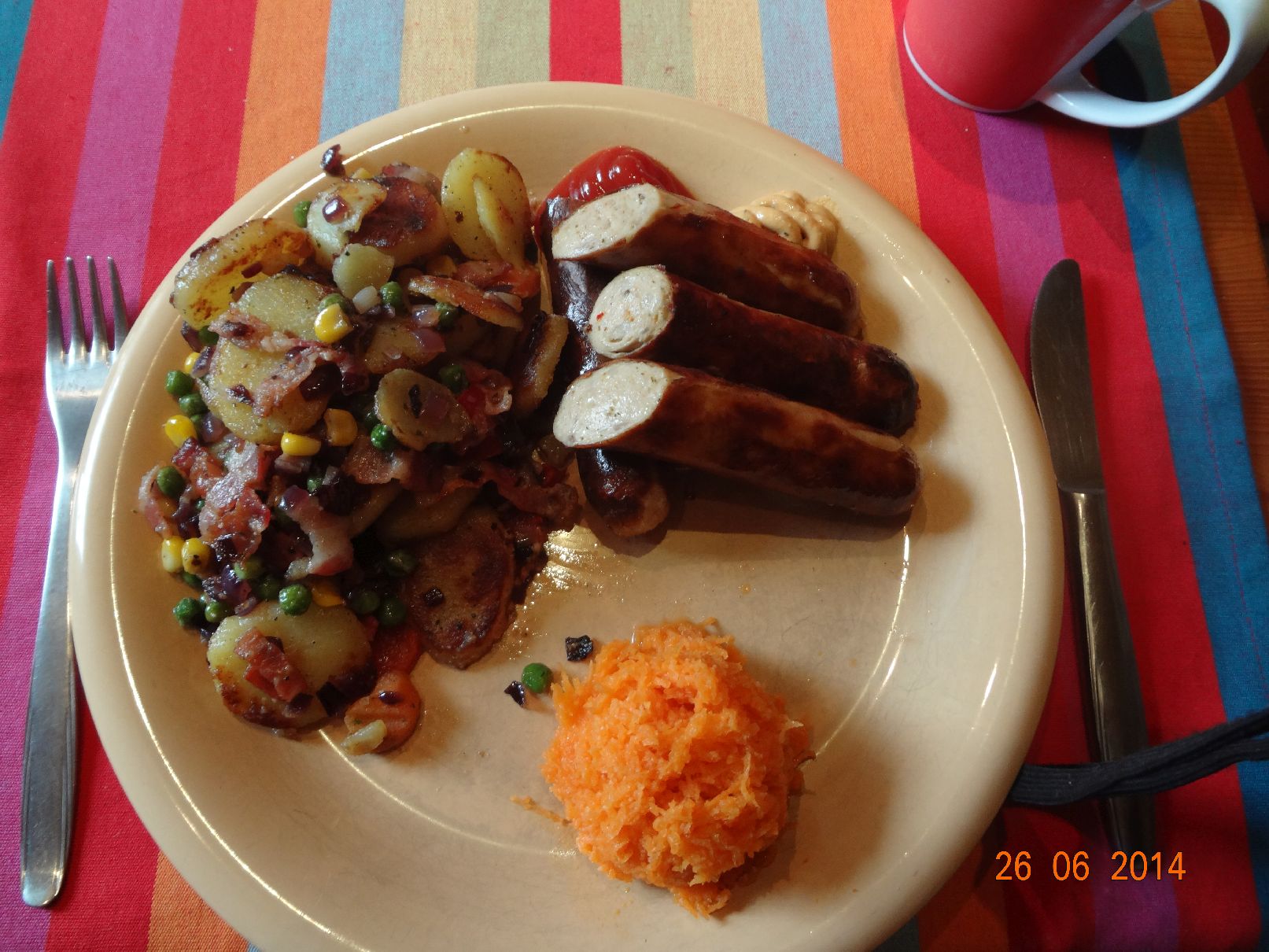 | Bratkartoffeln mit Gemüse und scharfen Bratwürstchen und Möhren-Salat |