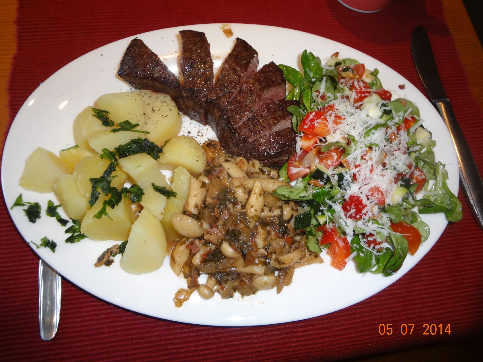 | American Beef mit Shimeji-Pilzen und gemischtem Salat und Rosmarin-Kartoffeln |
