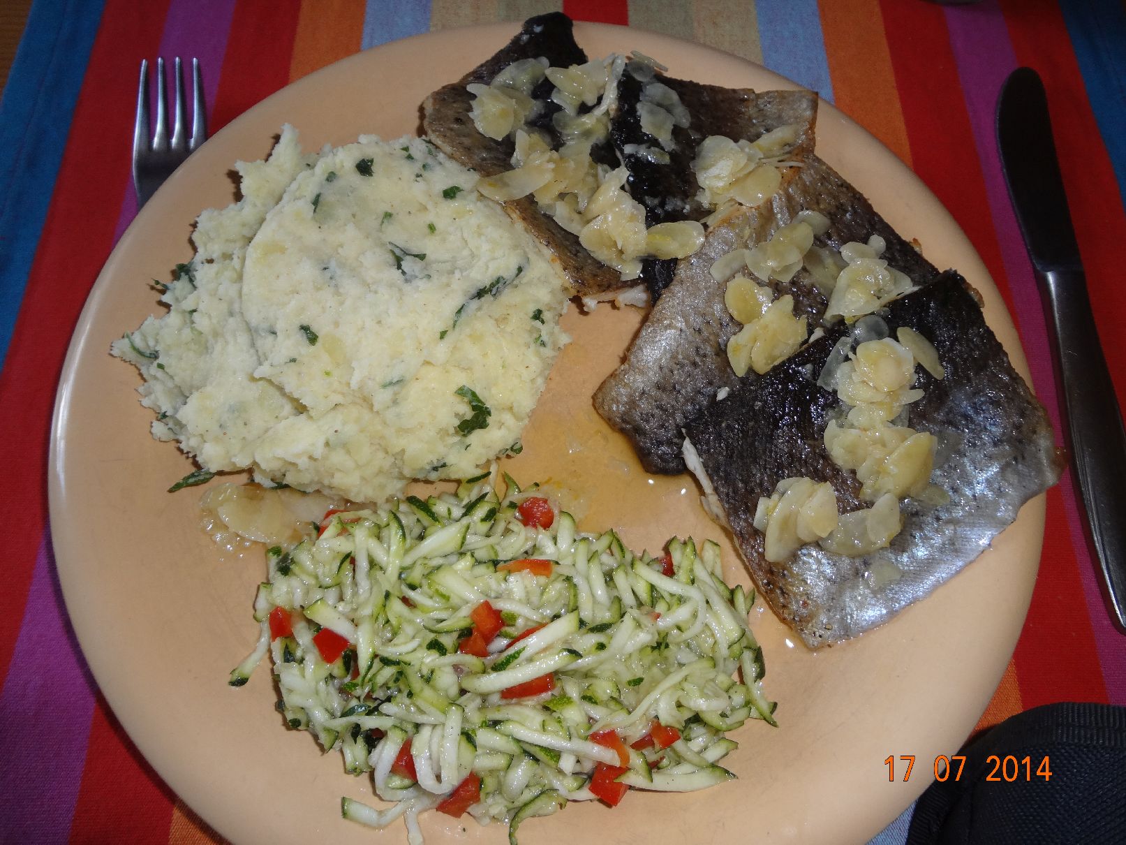 | Forellen-Filet Müllerin mit Mandel-Zitronen-Butter dazu Kartoffel-Petersilien-Stampf und Succhini-Salat |
