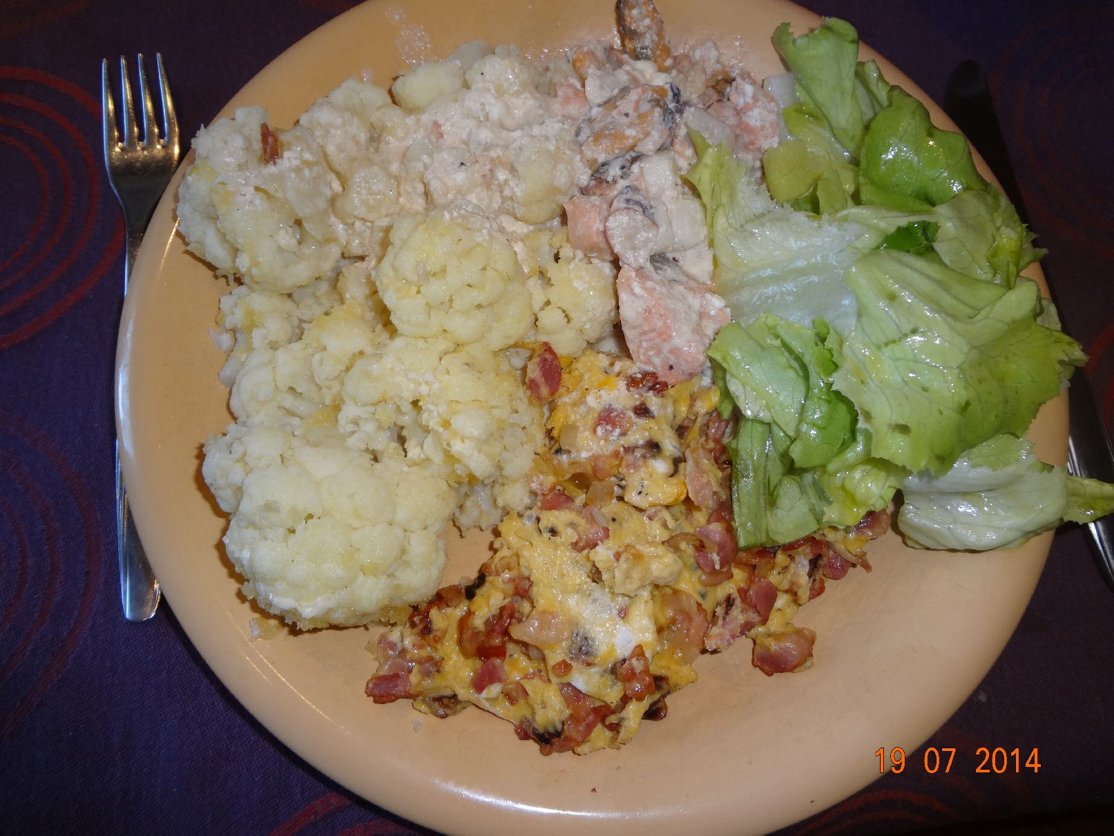 | Blumenkohl mit Meeresfrüchten und Rührei, Kopf-Salat |