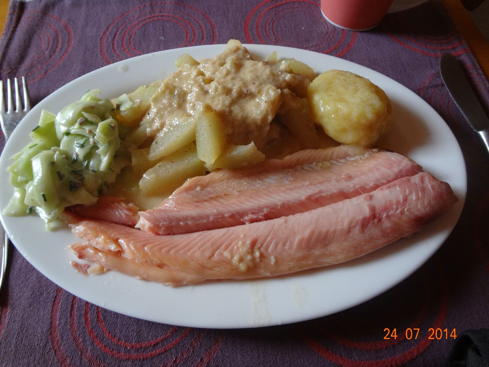 | Geräucherte Lachsforelle mit Kohlrabi-Panko-Soße, Gurken-Salat und Kartoffel-Klößen |