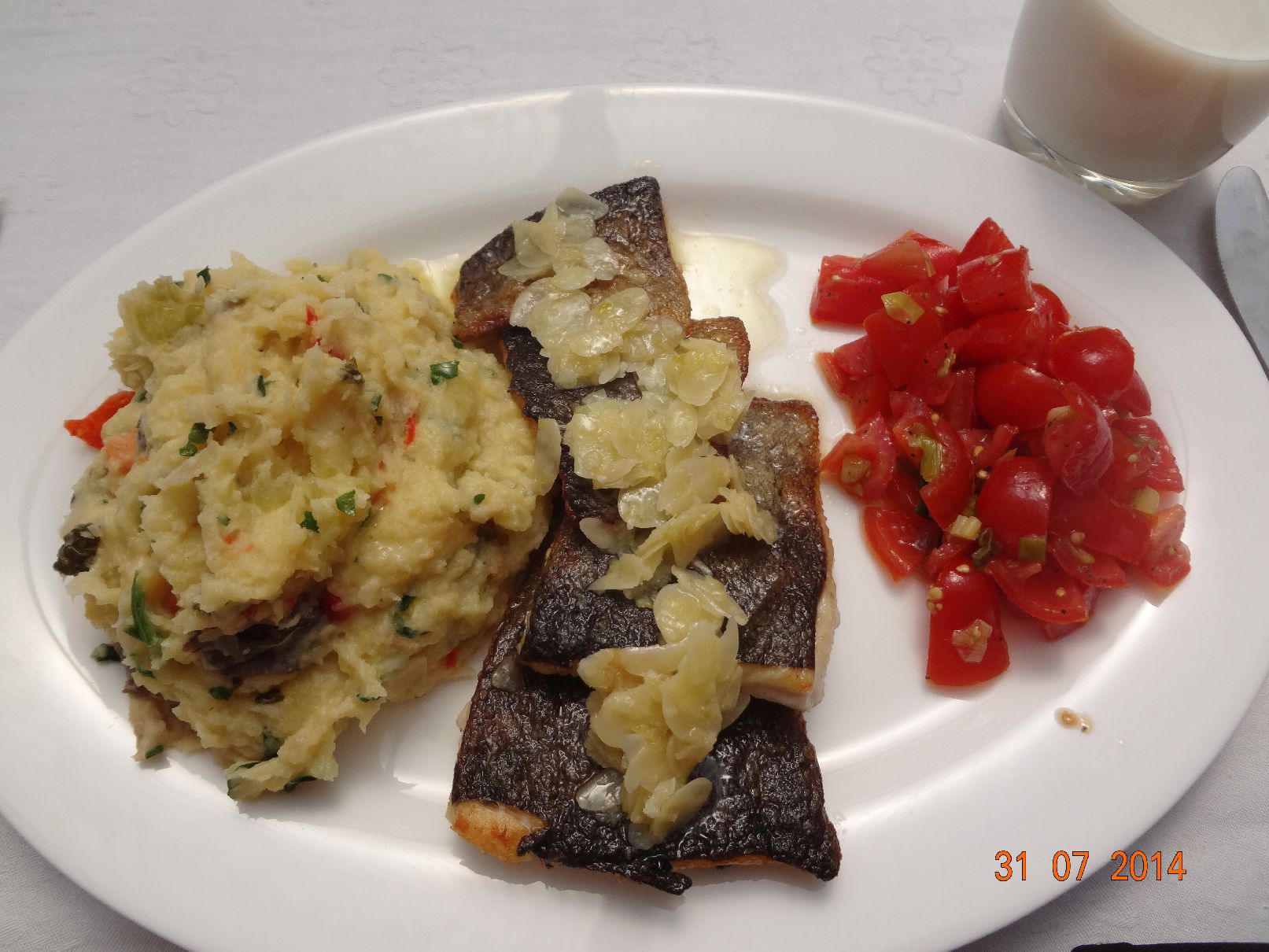 | Gebratenes Forellen-Filet mit Zitrone-Mandel-Butter und Kartoffel-Stampf mit asiatischem Pfannen-Gemüse, dazu Tomaten-Salat |