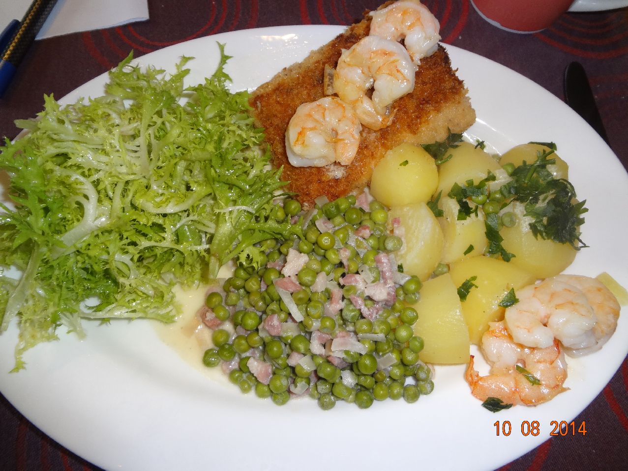 | Lachs-Filet, Schrimps, Erbsen-Gemüse, Frisee-Salat |