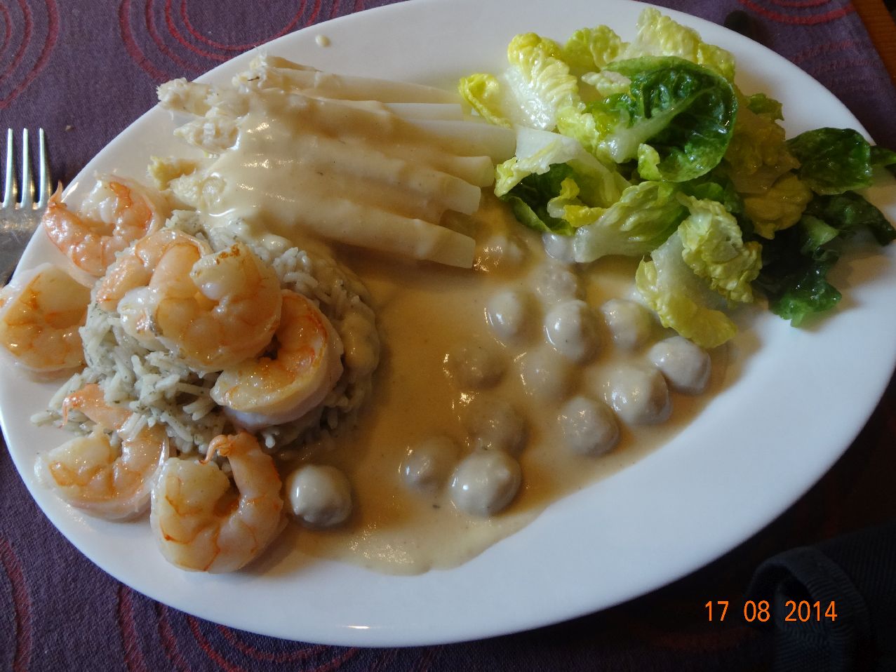 | Spargel mit Klößchen-Soße, Garnelen und Basmati-Reis, Mini-Salatköpfe |