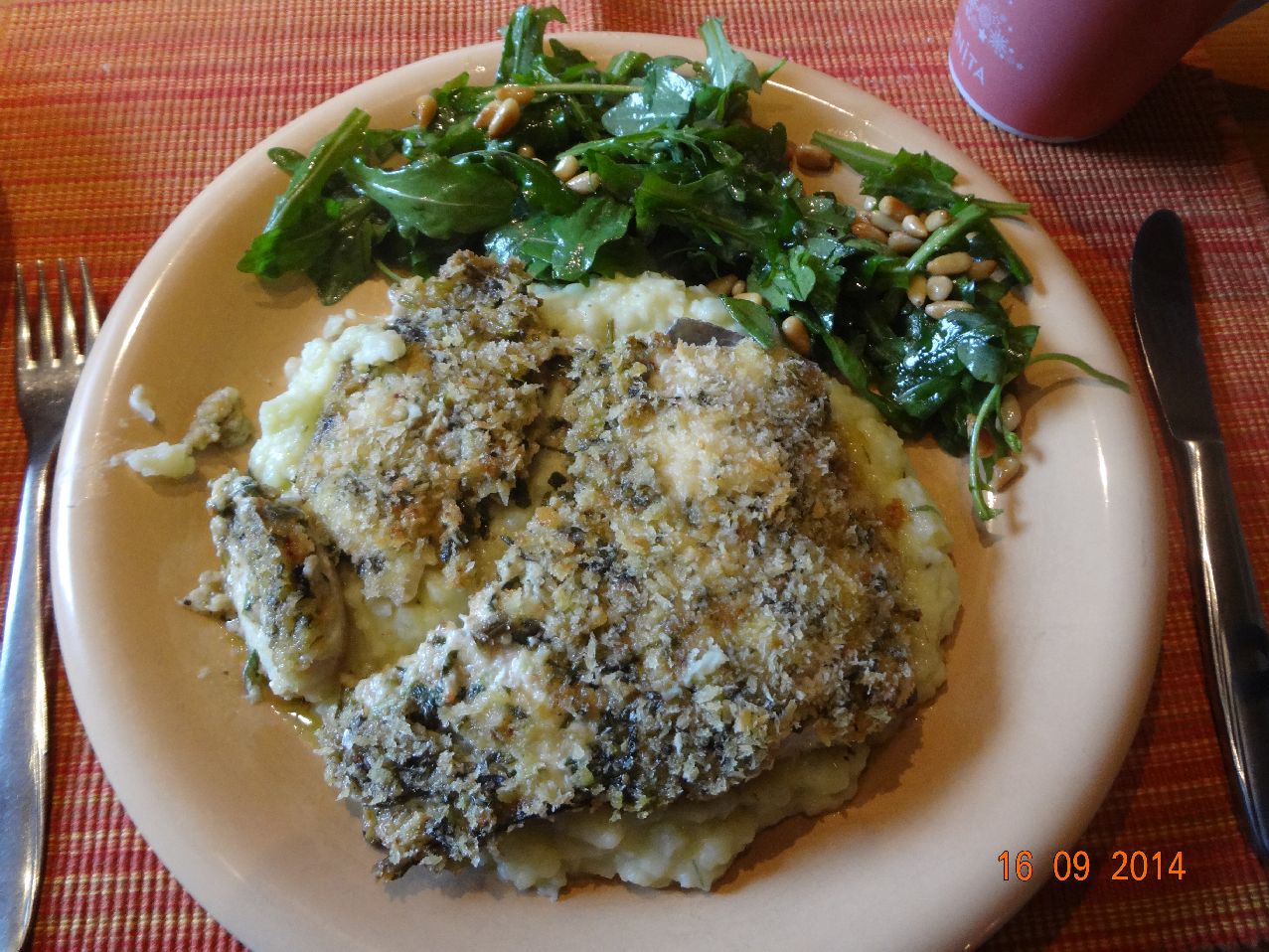 | Forellen-Filet unter Kräuter-Panierung mit Kartoffel-Kohlrabi-Püree und Rucola-Salat mit Pinien-Kernen |