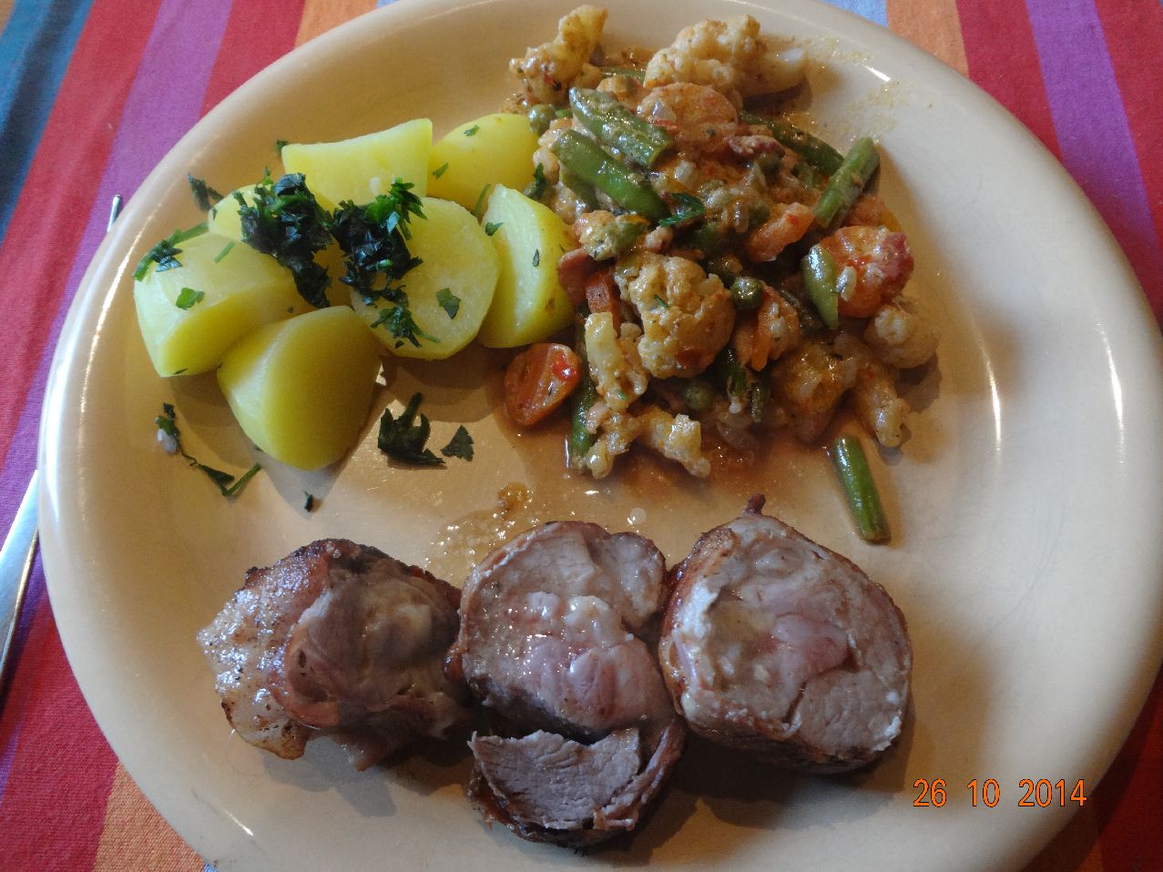 | Schweine-Filet im Speck-Mantel mit Käse, Mischgemüse und Petersilien-Kartoffeln |