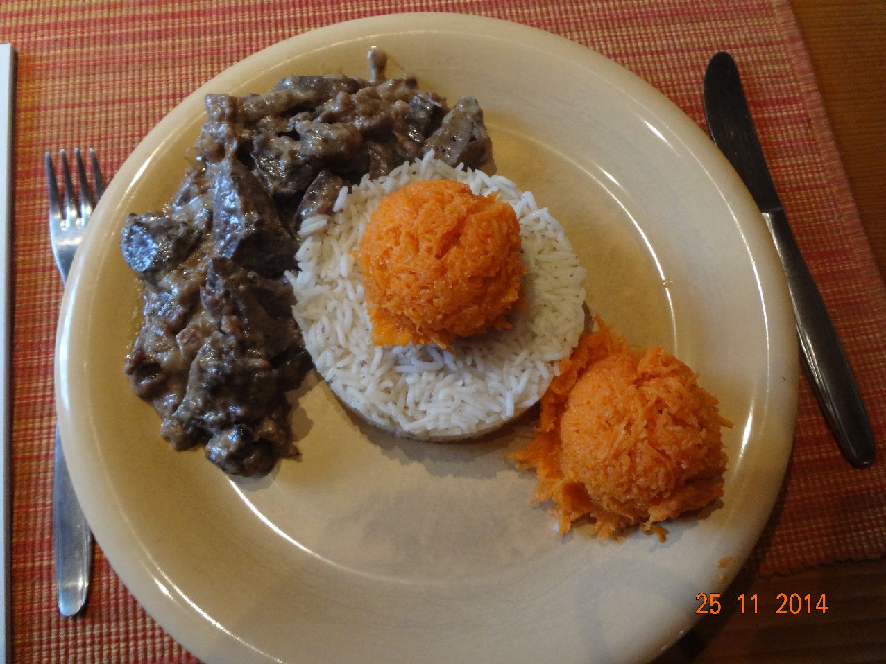 | Geflügel-Ragout aus Innereien, Basmati-Reis und Möhren-Salat |