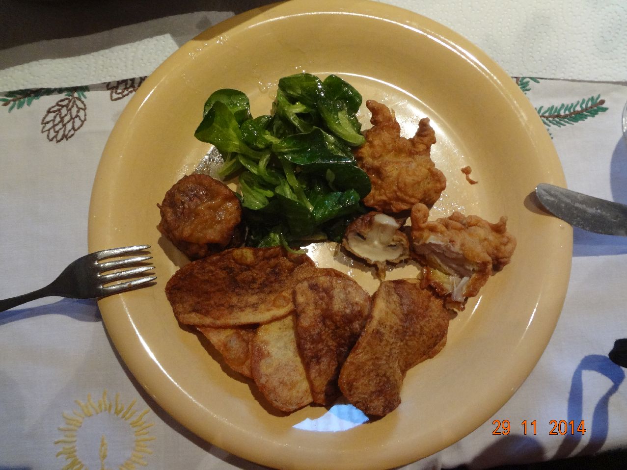 | Hähnchen im Schlafrock und Champignons im Schlafrock, selbstgemachte Kartoffel-Chips und Feld-Salat |