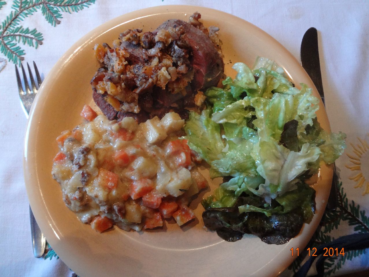 | Steak und Kartoffel-Möhren-Sellerie-Stampf |