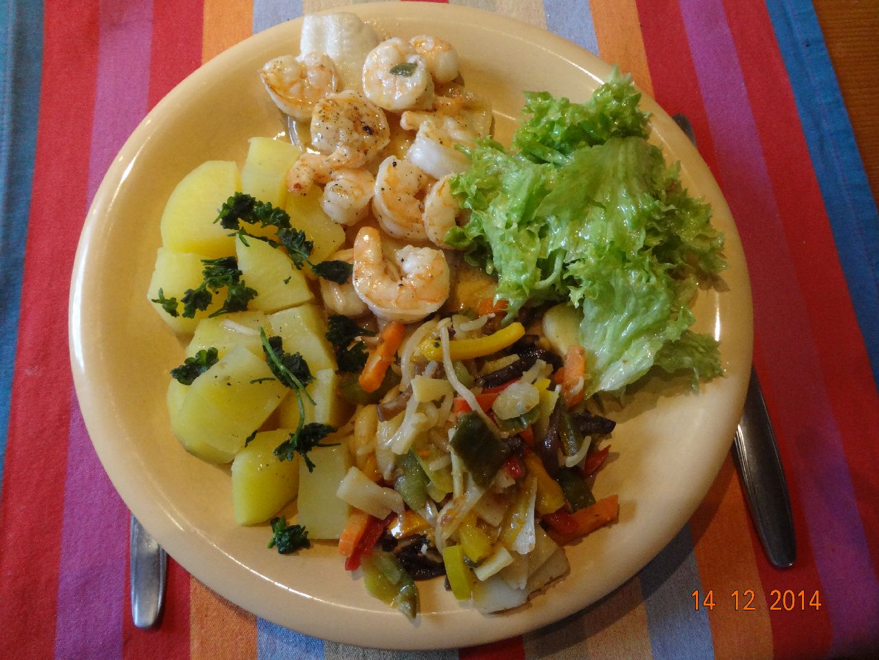 | Schollen-Filet und Garnelen mit Gemüse asiatischer Art und Rosmarin-Kartoffeln |