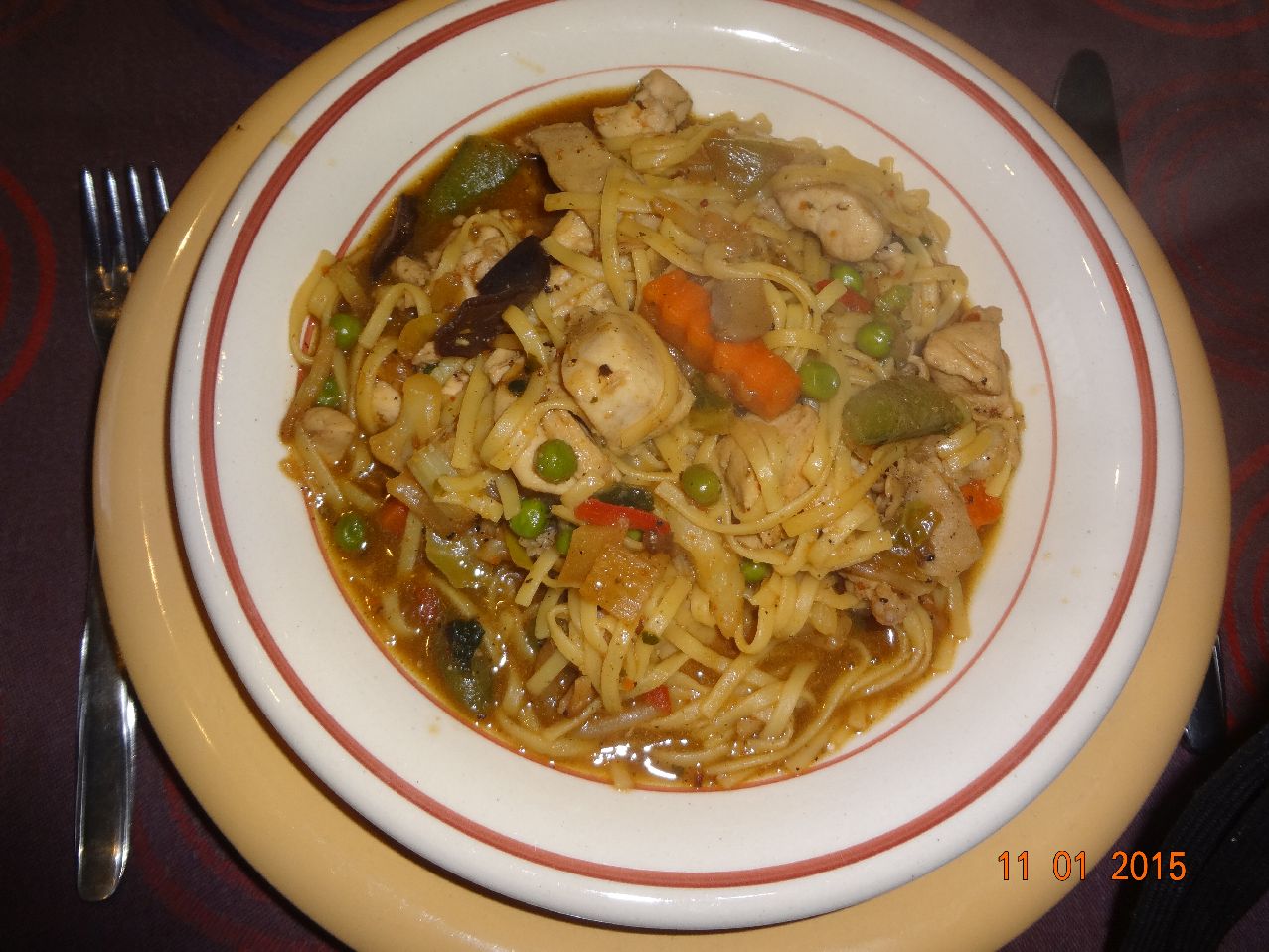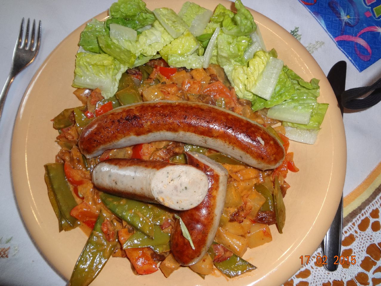 | Bratwurst auf Gemüse-Pfanne mit Rum-Rosinen (Paprika, Schoten, Sellerie, Kohlrabi, Zwiebeln, Speck) |