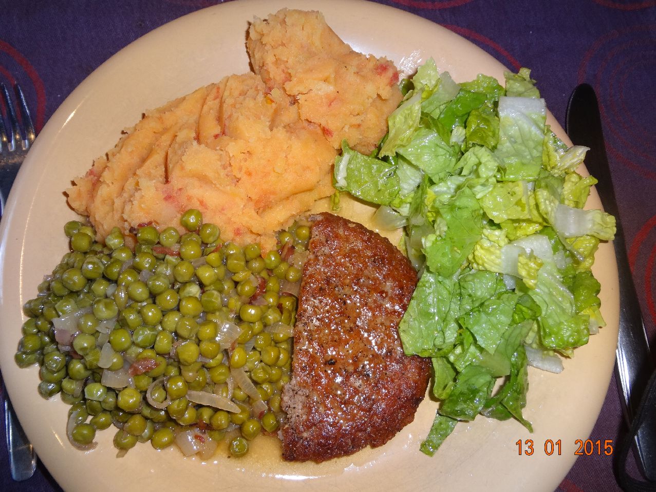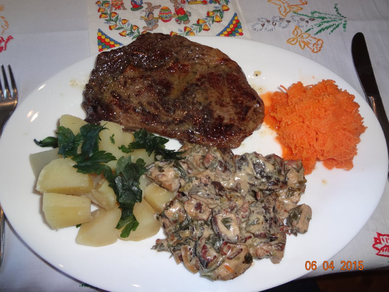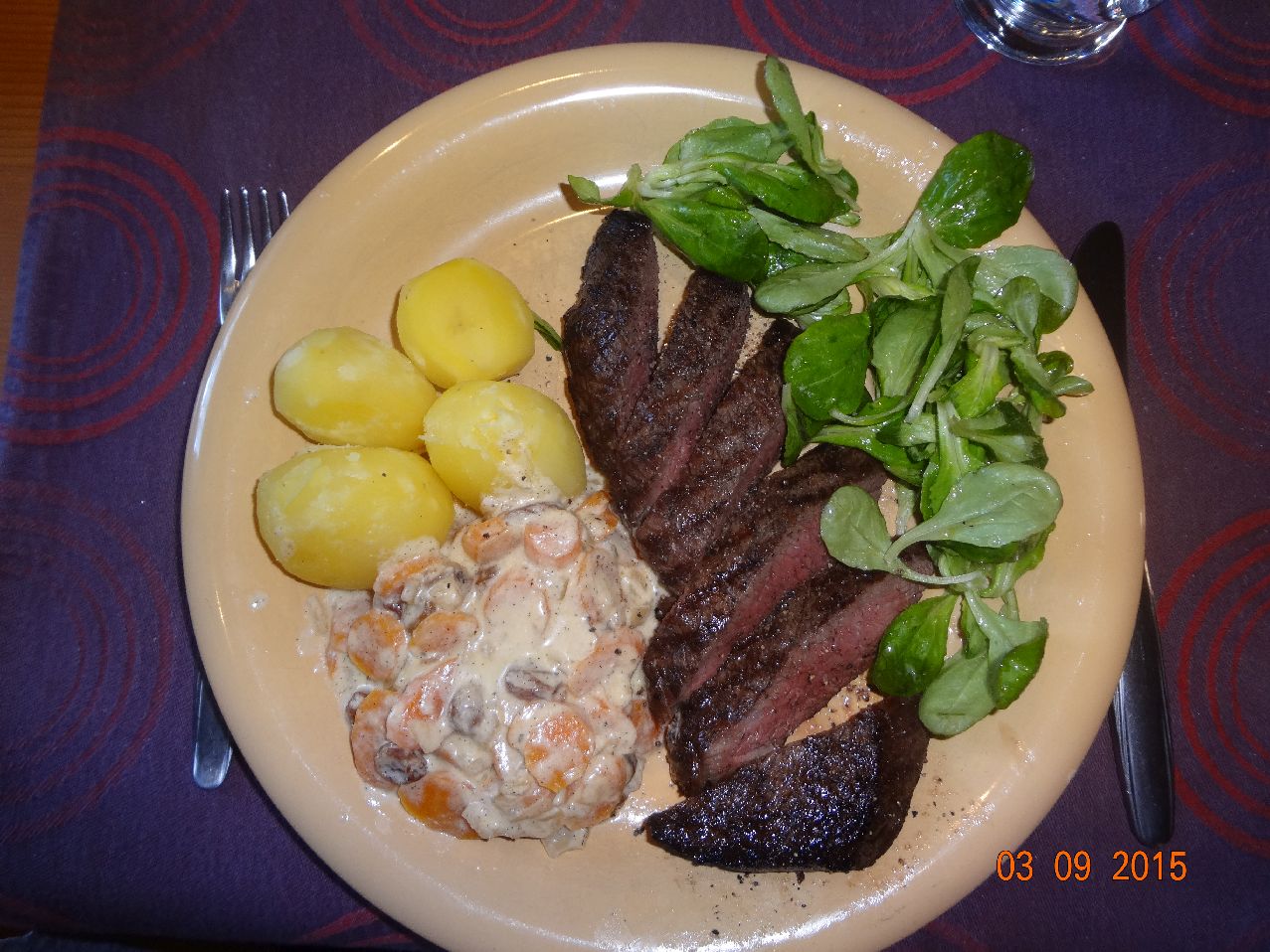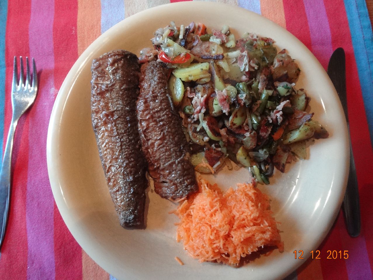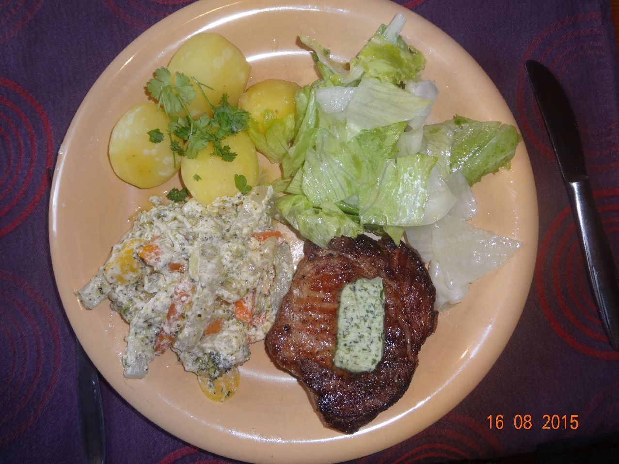| Rumpsteak mit Gemüse-Bratkartoffeln und Möhren-Salat (*) |