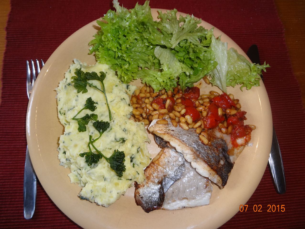 | Gebratenes Wolfsbarsch-Filet (+) mit Kartoffel-Porree-Püree, Feld-Salat |