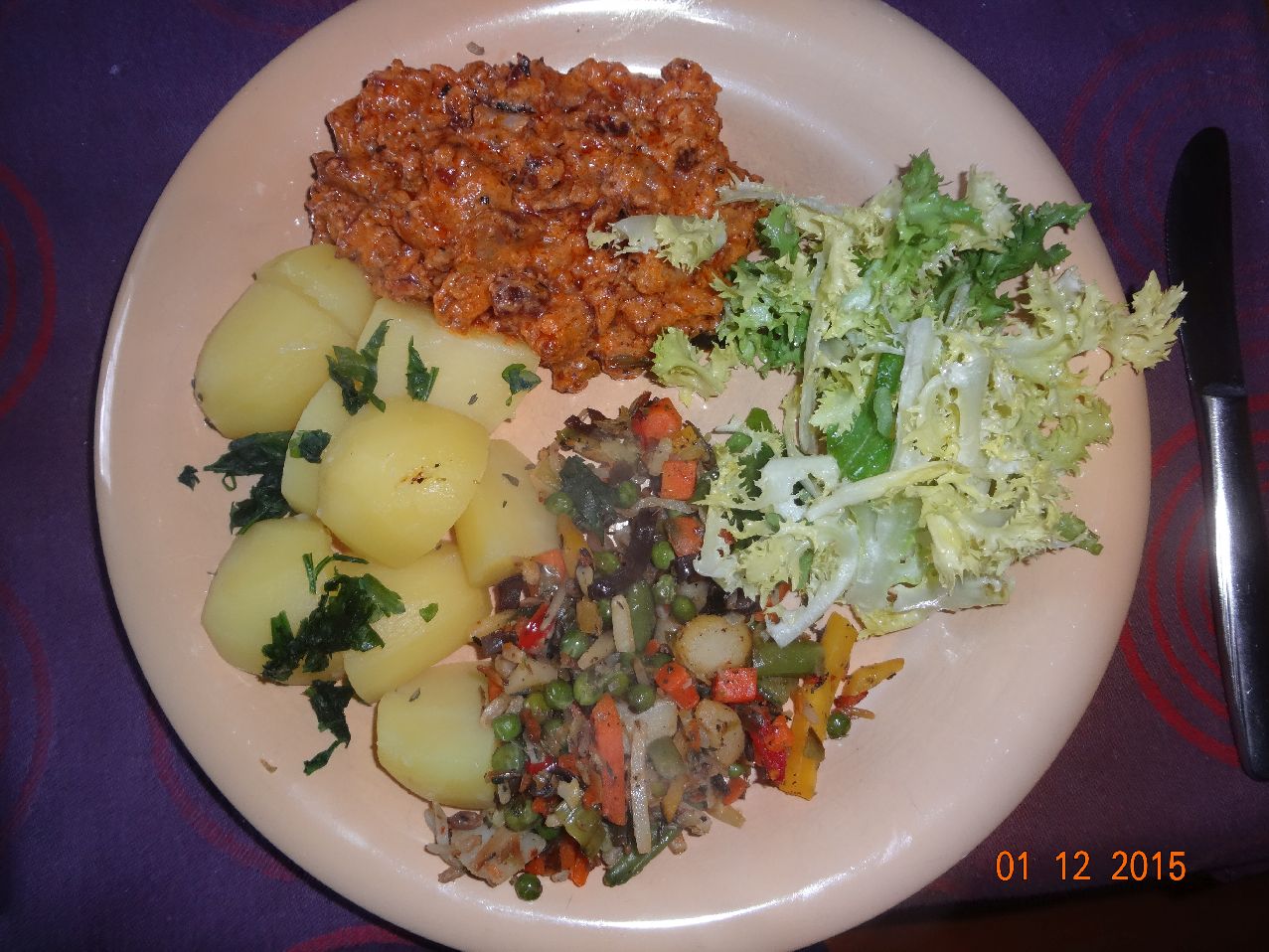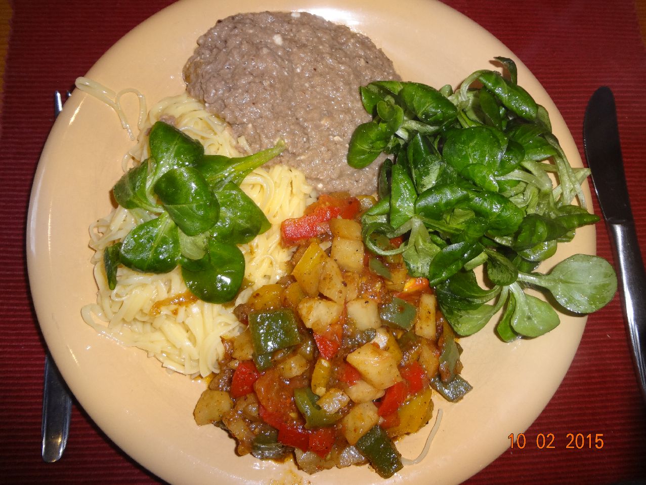 | Lamm-Püree, Schnittnudeln und Tomat-Paprika-Sellerie-Gemüse, Feld-Salat |