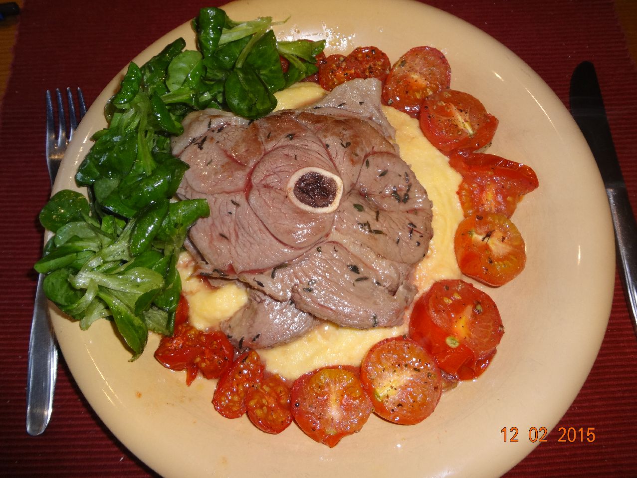 | Lamm-Kotelett auf Polenta mit gegrillten Tomaten und Feld-Salat |