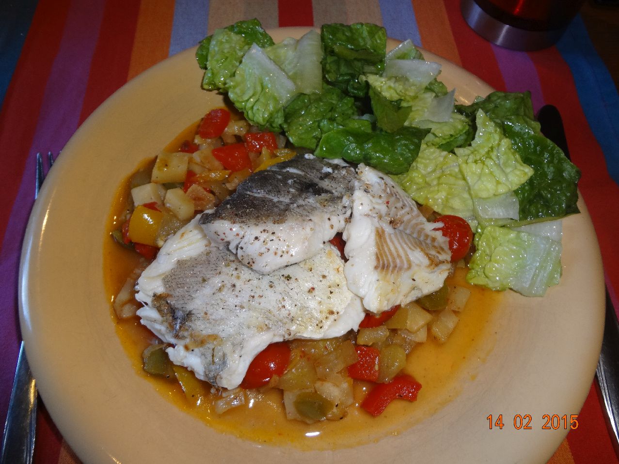 | Gebratener Schellfisch auf gebratenem Gemüse-Bett (Aubergiene, Paprika, Sellerie, Tomate, Zucchini) |