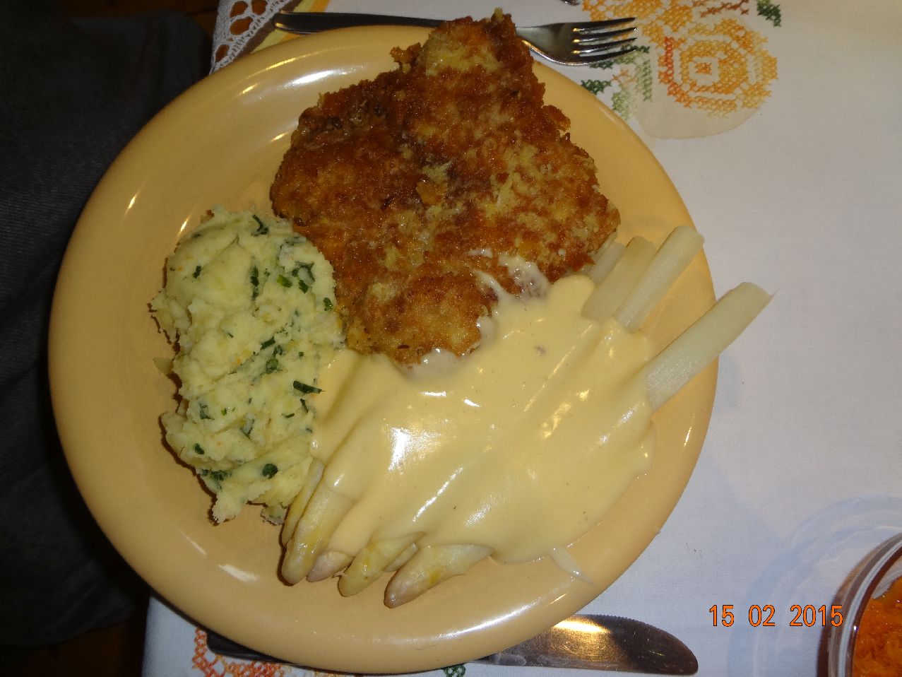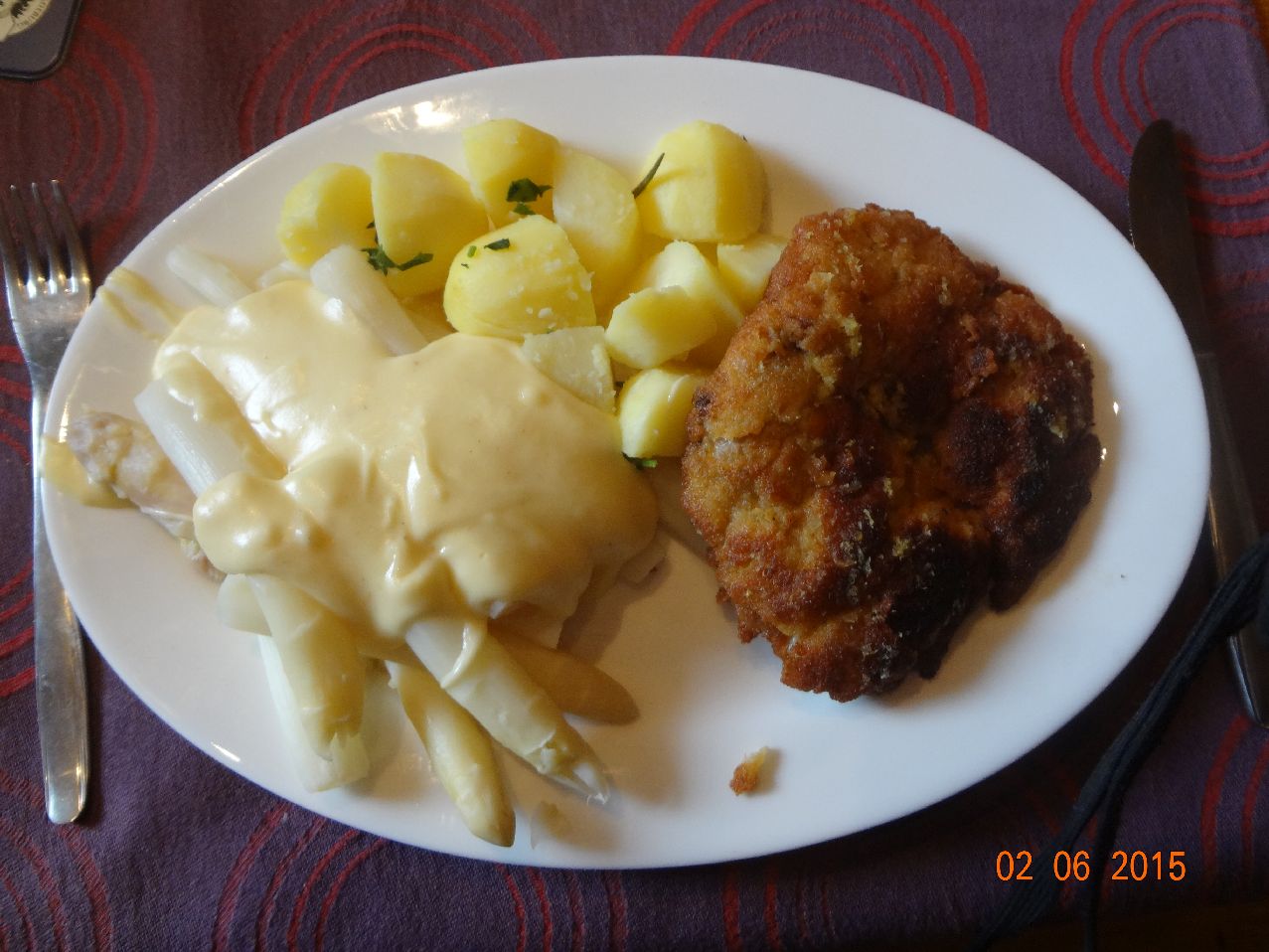 | Hähnchen-Schnitzel, Spargel mit holländischer Soße, Schnittlauch-Petersilie-Sellerie-Stampf |