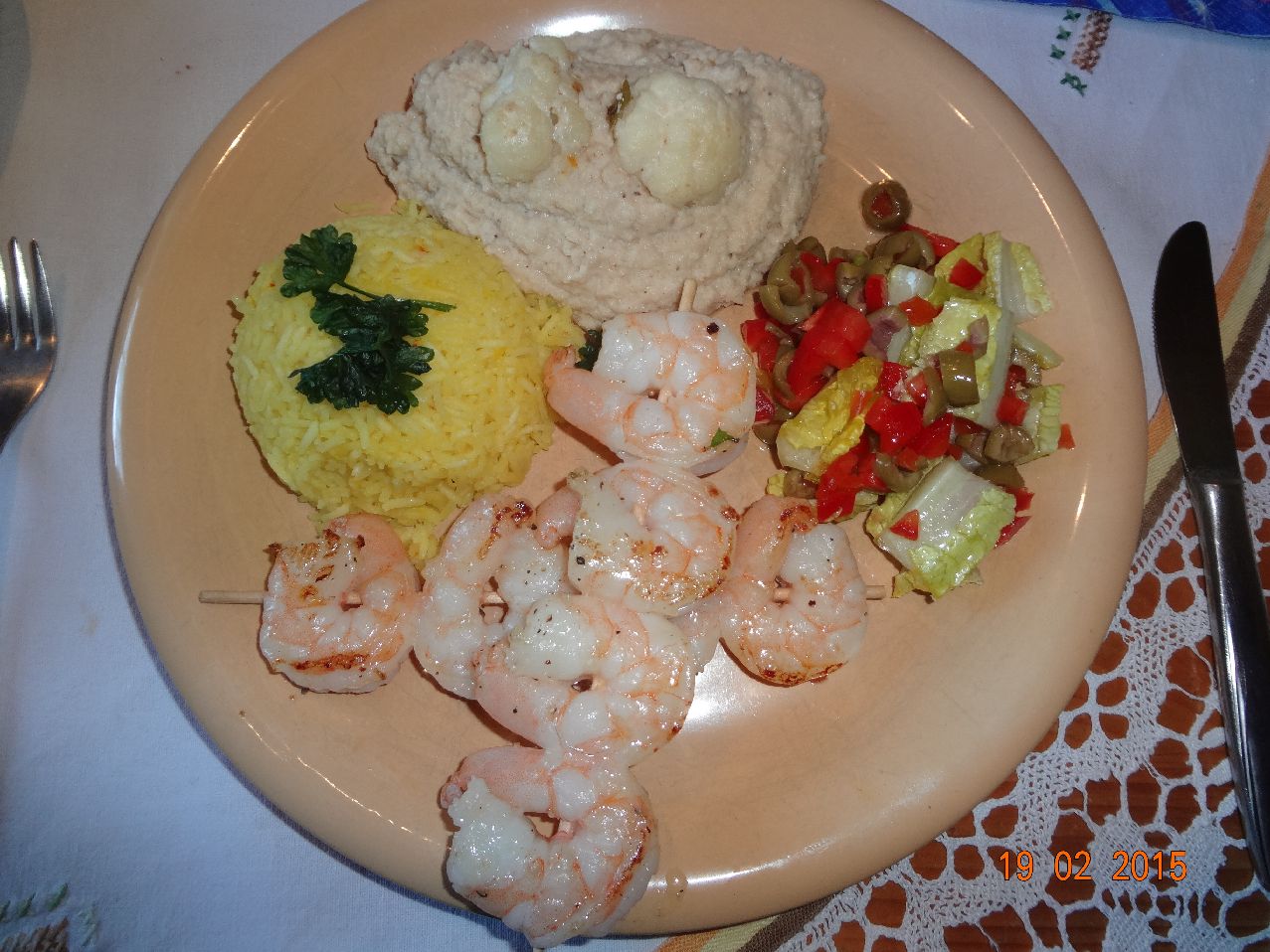 | Garnelen-Spieße mit Blumenkohl-Püree (-) und Safran-Reis, dazu Salat mit Paprika und Oliven (+) |
