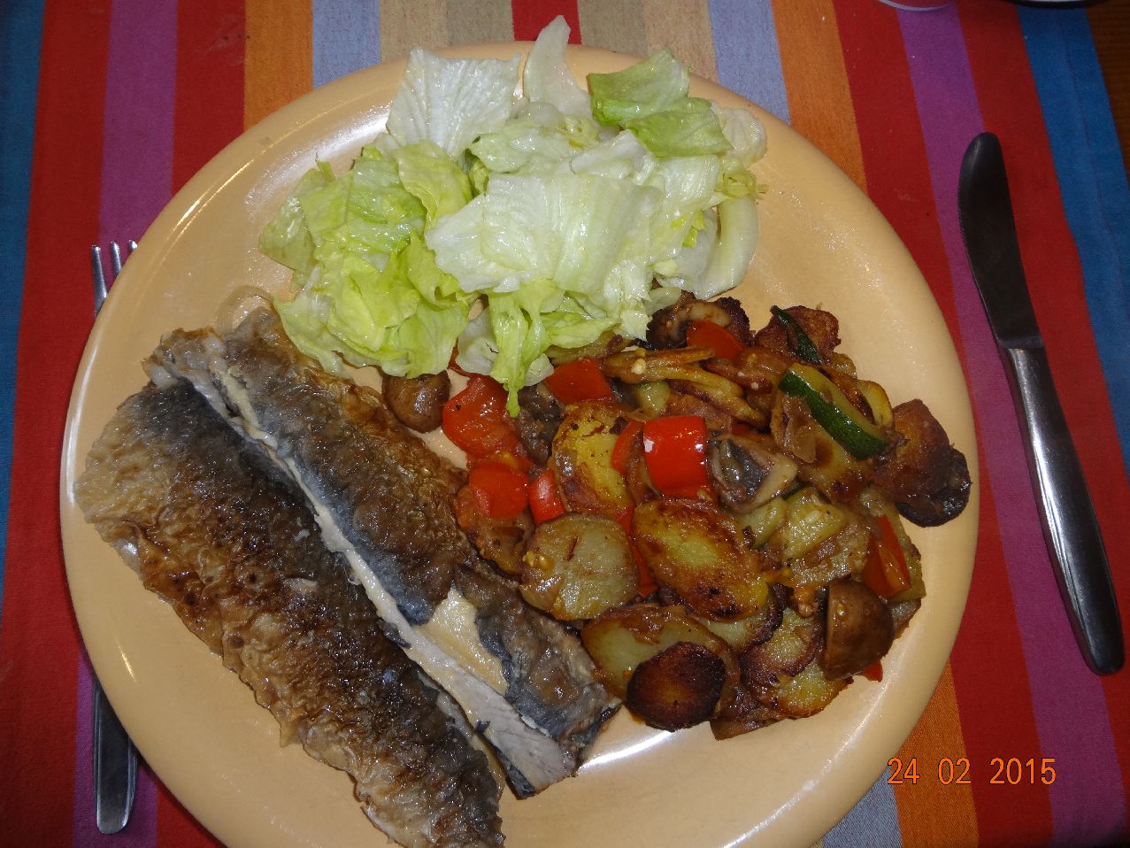 | Bratkartoffeln mit Gemüse, Kiwi und geräuchertem Hering, Lollo-Bionda-Salat |