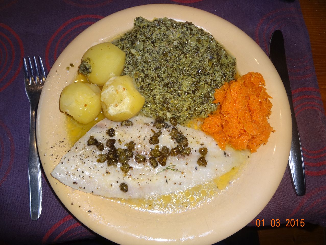 | Bratklops mit Rum-Rosinen auf Rahm-Porree mit Würzkartoffeln, Möhren-Salat |