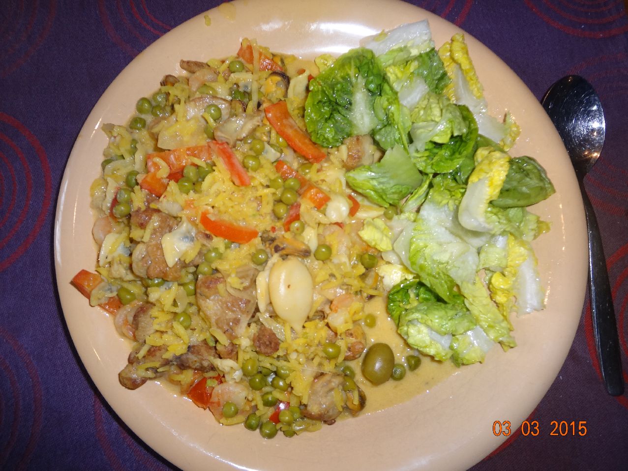 | Meeresfrüchte in Weißwein-Soße auf Safran-Basmati-Reis und Lollo-Bionda-Salat |