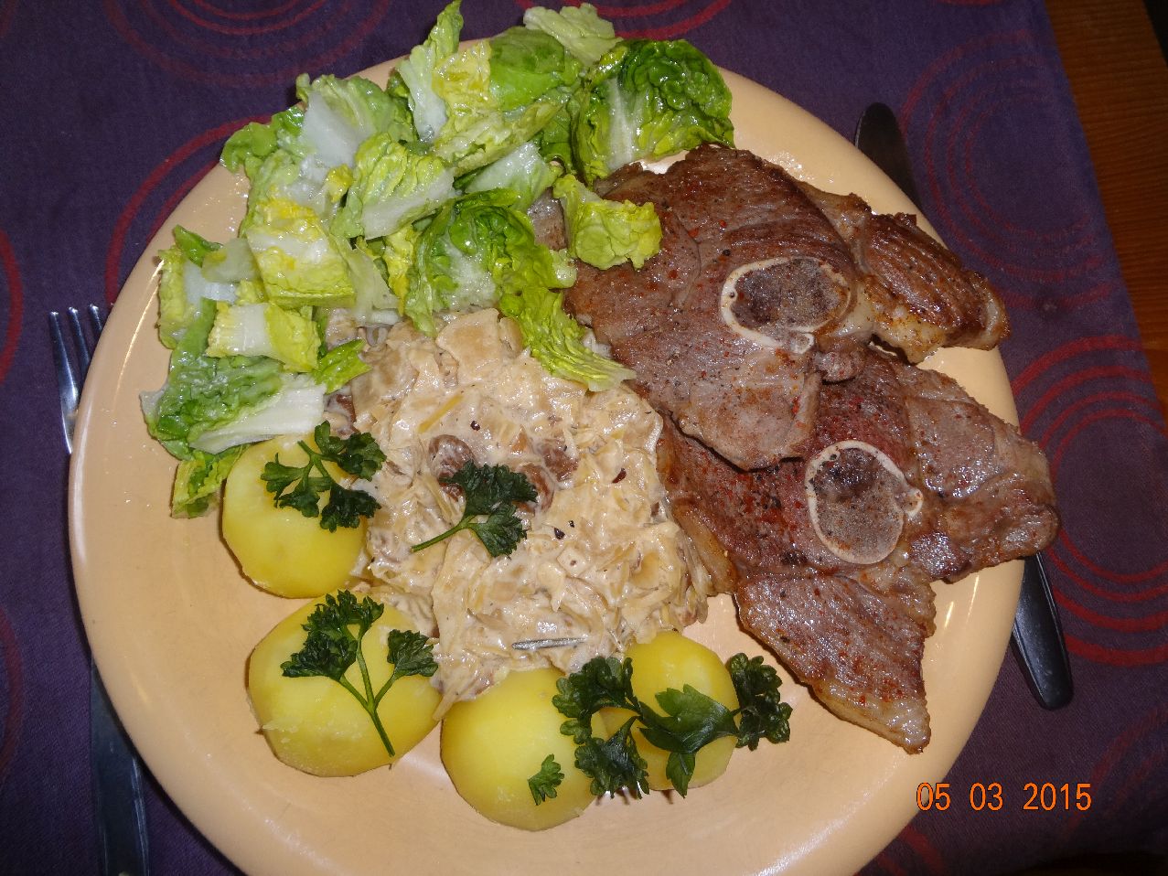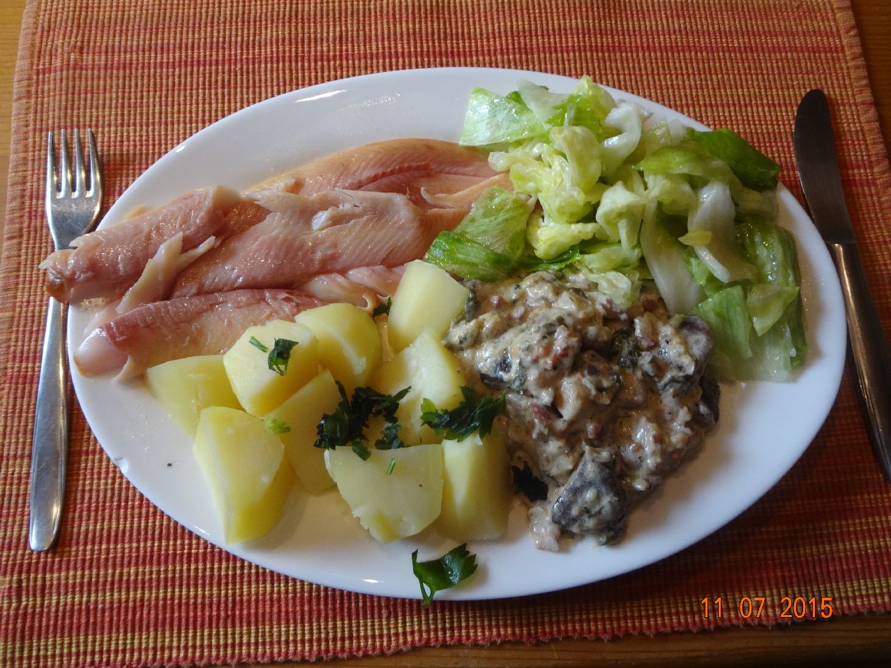 | Selbstgeräucherte Forelle mit Pilzen in Sekt-Rahm-Soße (*) mit Rosmarin-Kartoffeln und Eisberg-Salat |