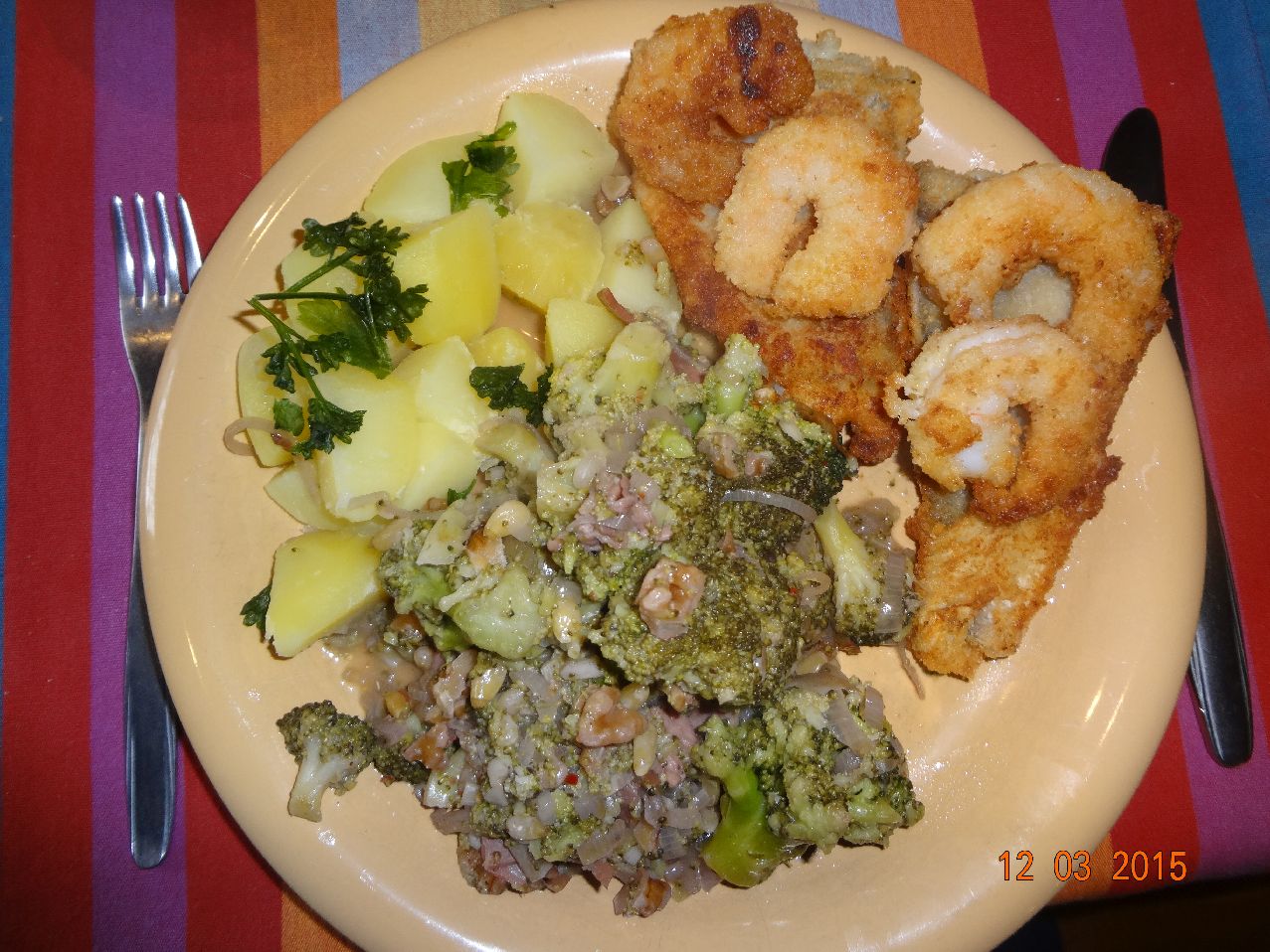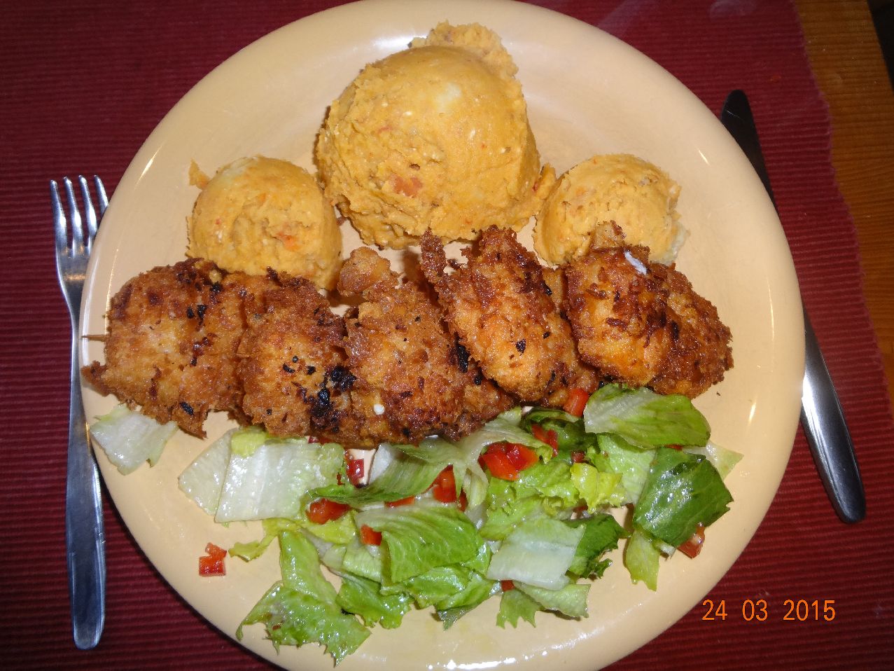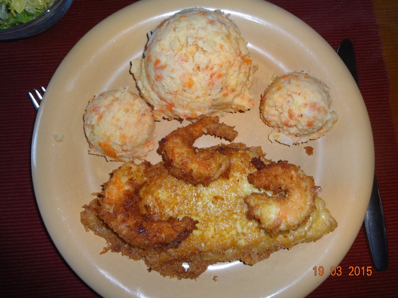 | Garnelen im Käse-Mantel und Gemüse-Kartoffel-Püree |