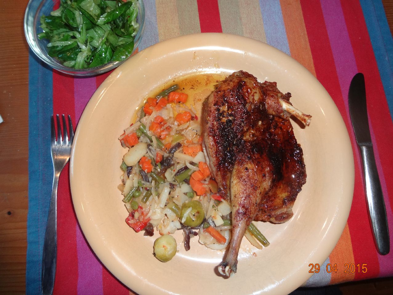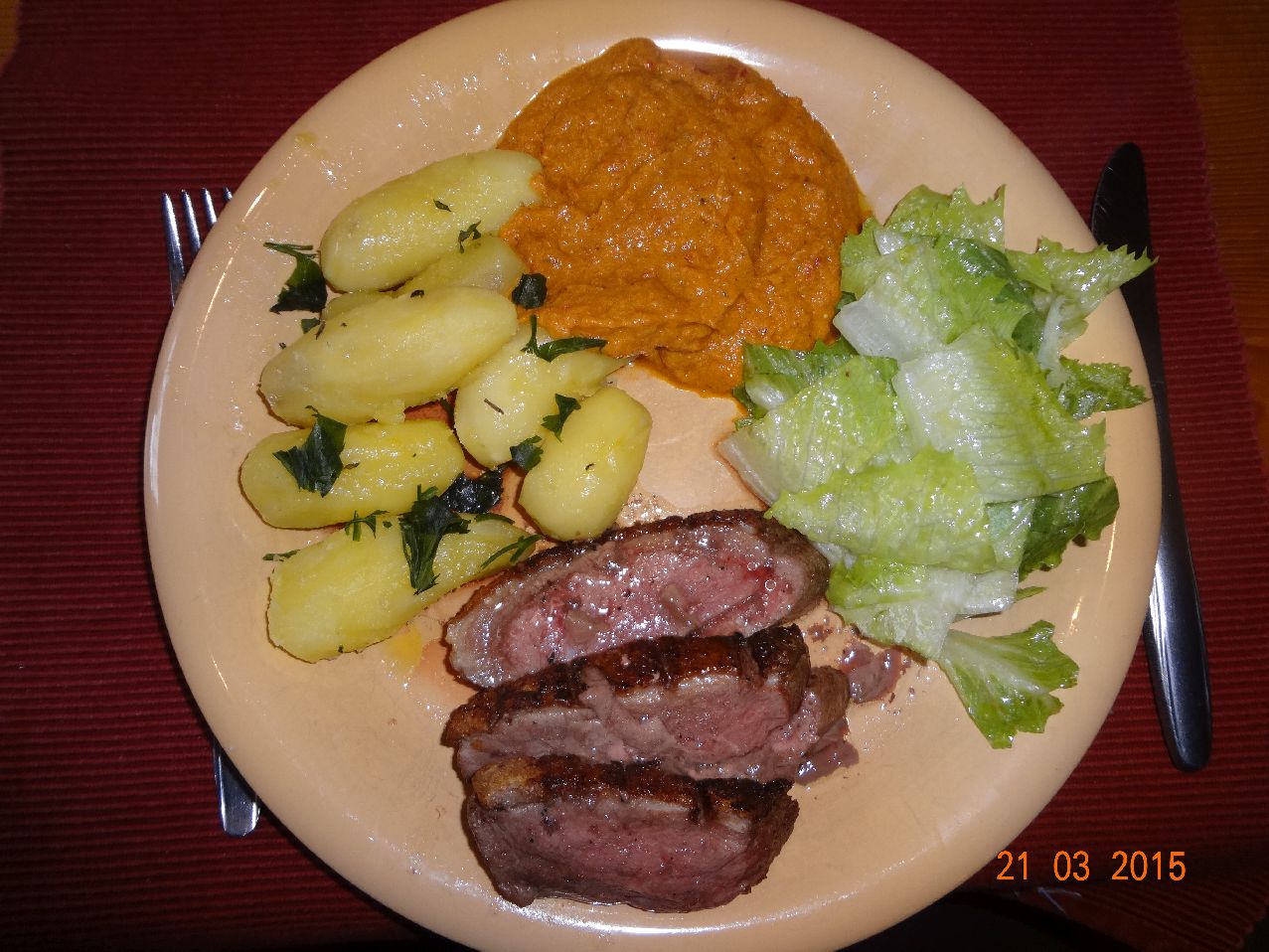 | Enten-Brust mit Gemüse-Püree und Rosmarin-Kartoffeln in Olivenöl geschwenkt und SalaRico-Salat |