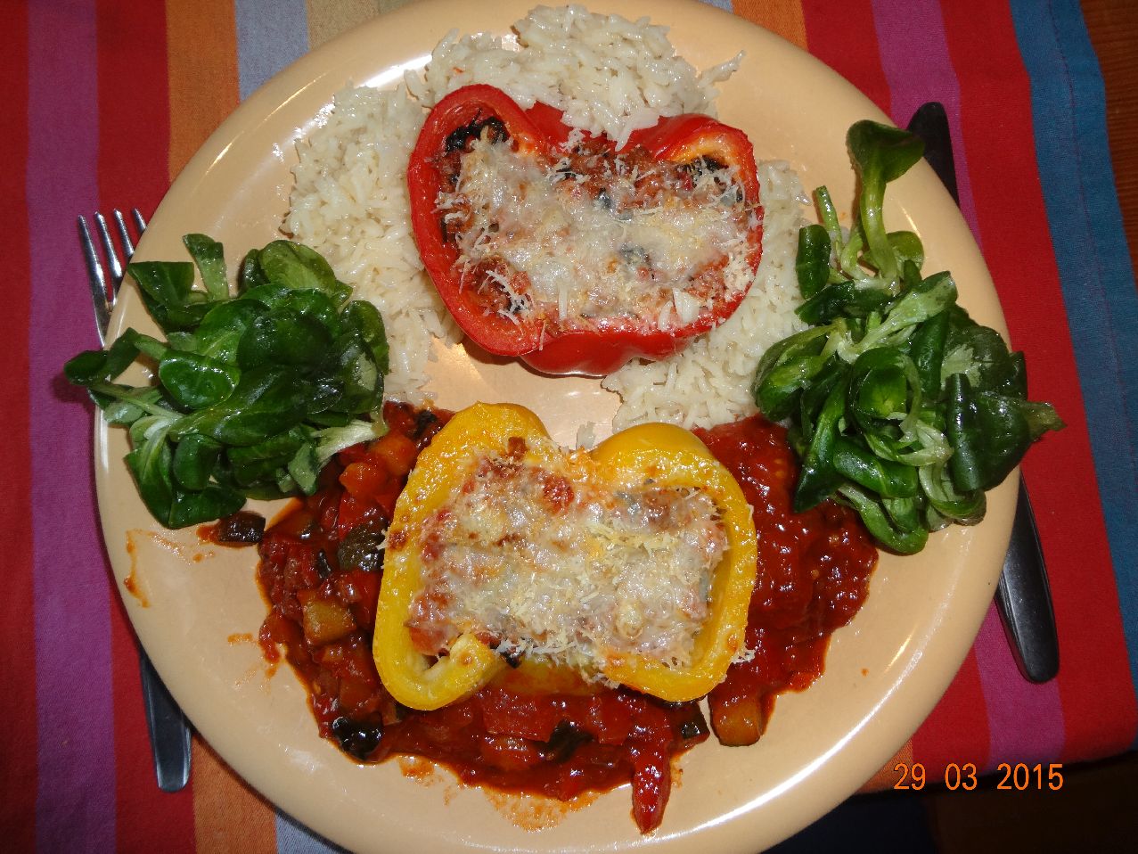 | Gefüllte Paprika-Schoten mit Tomaten-Zucchini-Gemüse, Basmati-Butter-Reis und Feld-Salat |