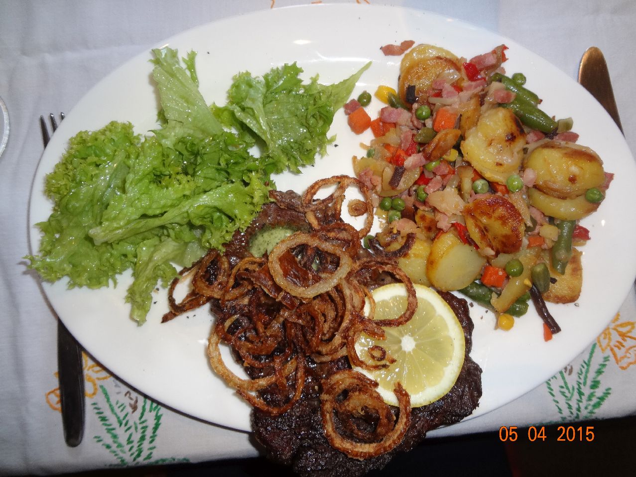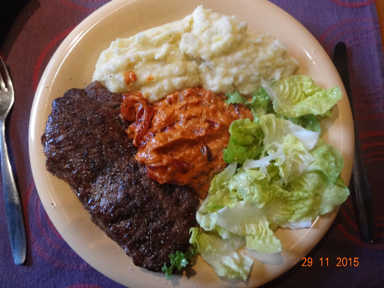 | Steak mit Zwiebeln und Salat |