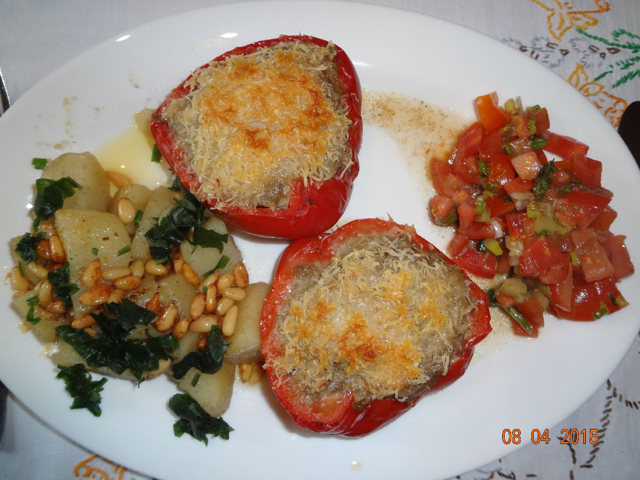 | Mit Hackfleisch vom Wagyu-Rind gefüllte Paprika-Schoten und Würzkartoffeln mit Pinien-Zitronen-Butter |