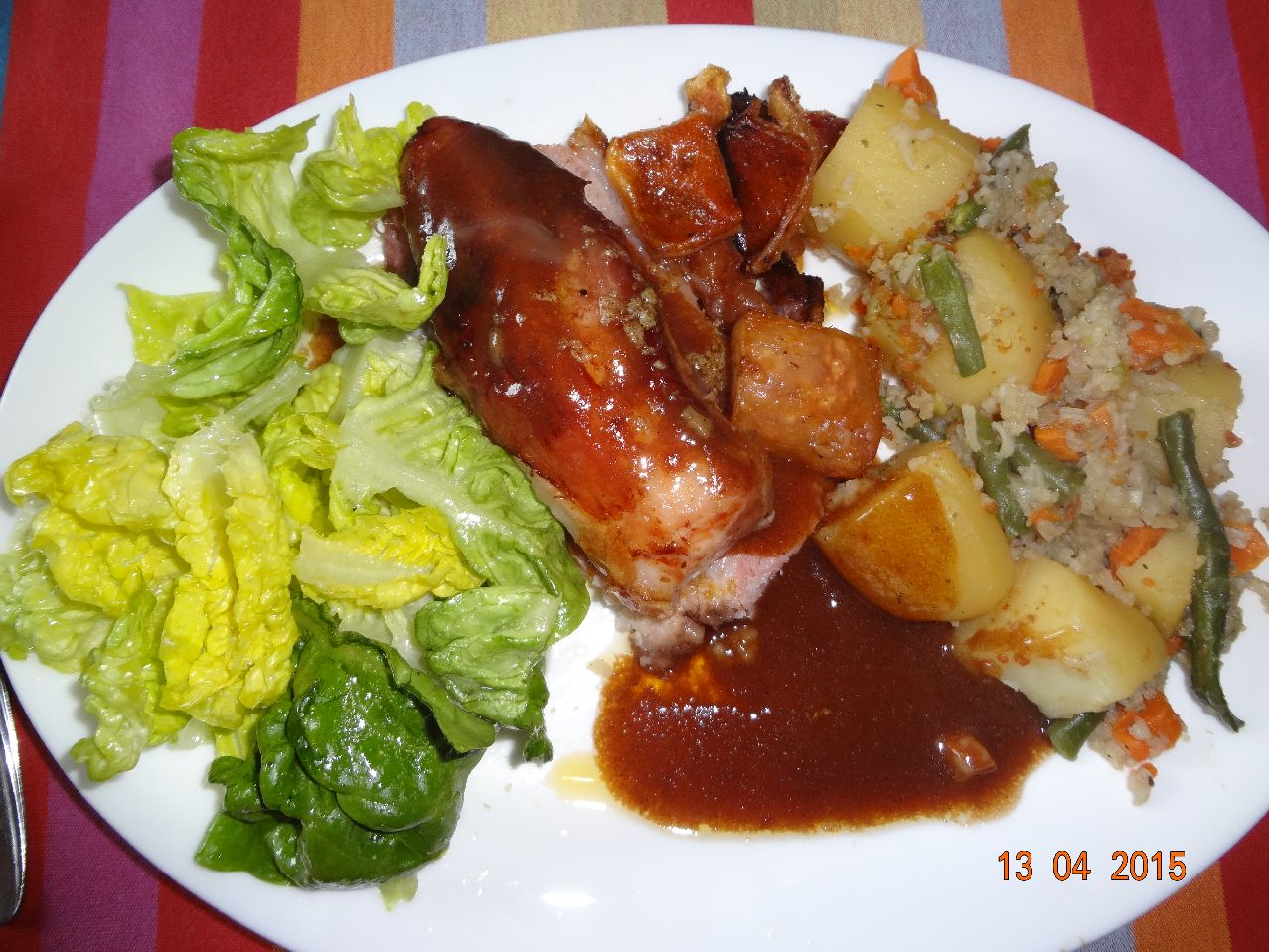 | Krusten-Braten mit Kartoffel-Reis-Gemüse |